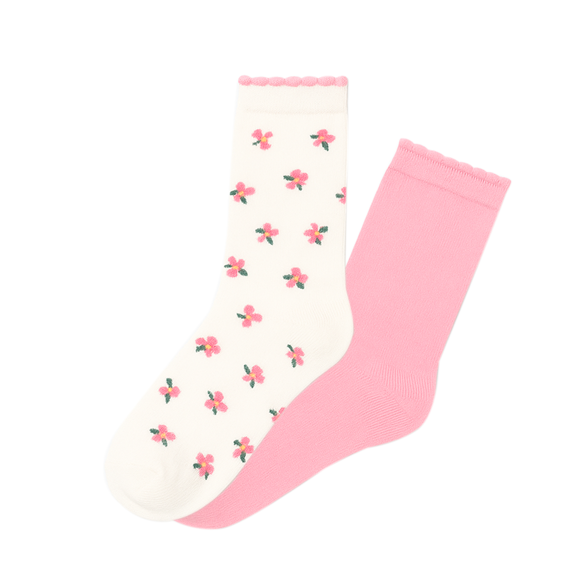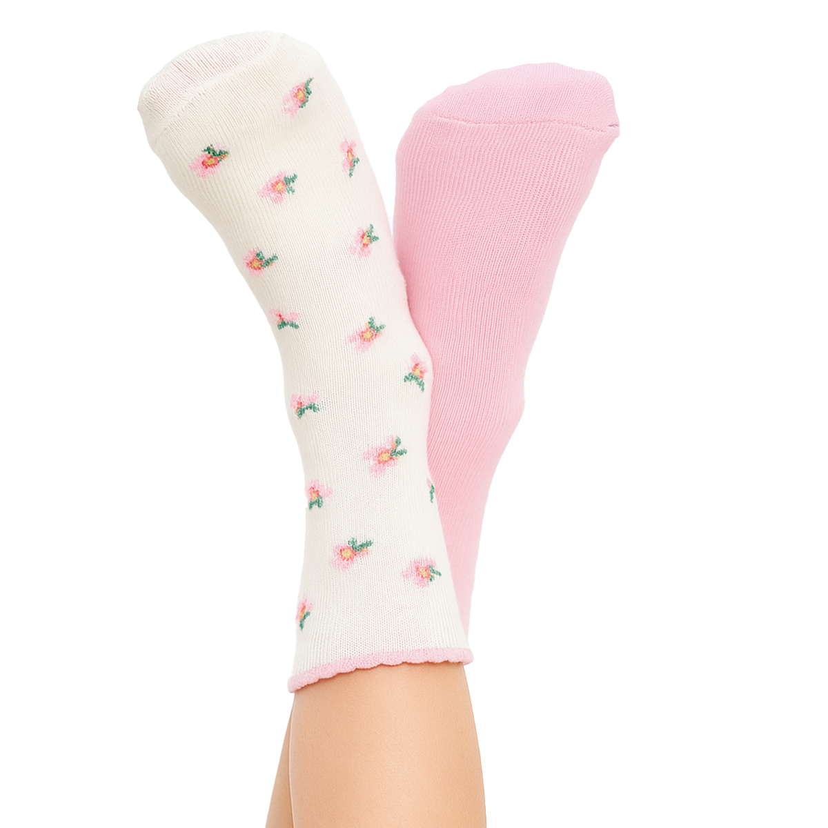 Dale un toque único y encantador a tu outfit con este adorable par de medias. Este dúo incluye un calcetín en tono crema con un delicado estampado de flores color rosa y otro en un sutil rosa pastel liso.