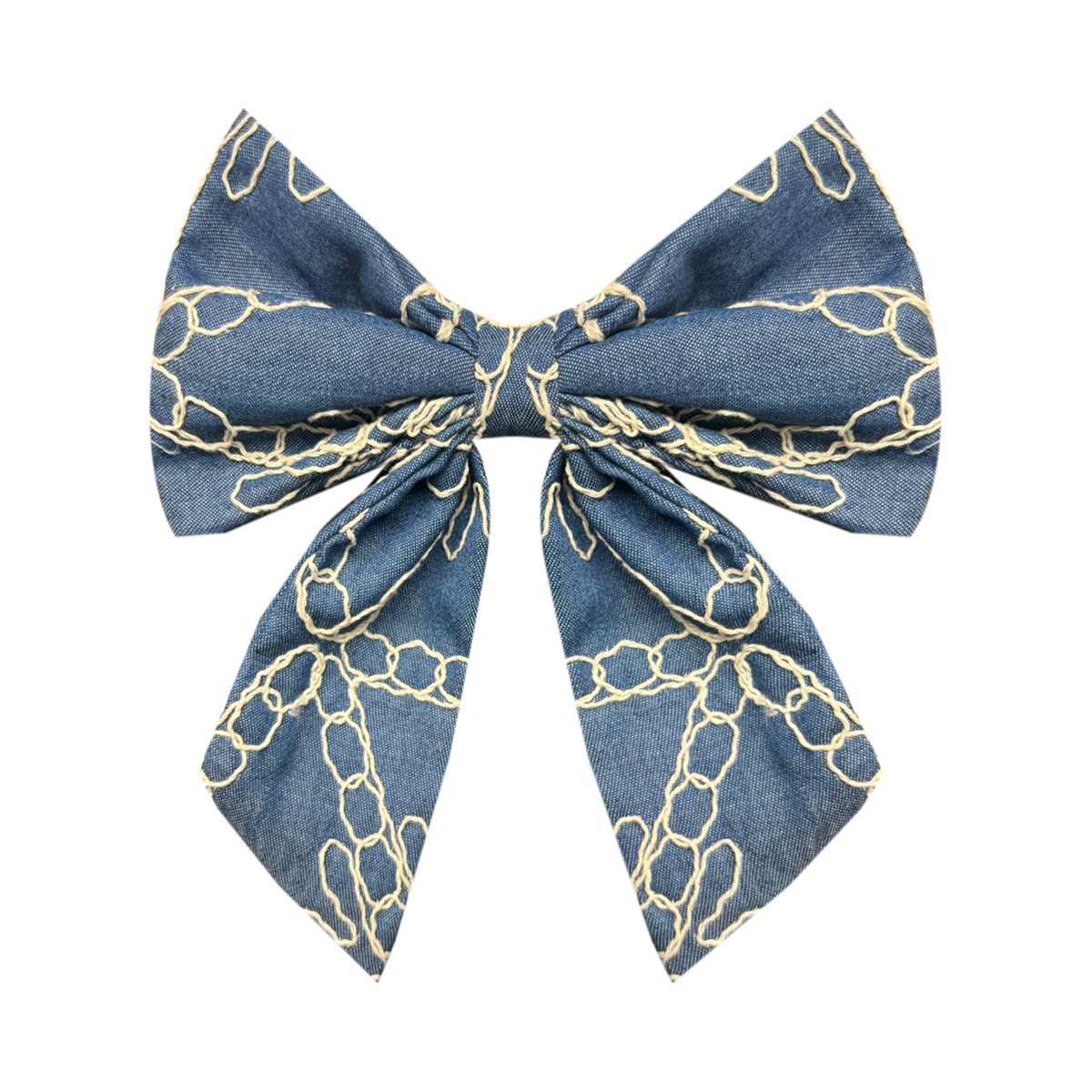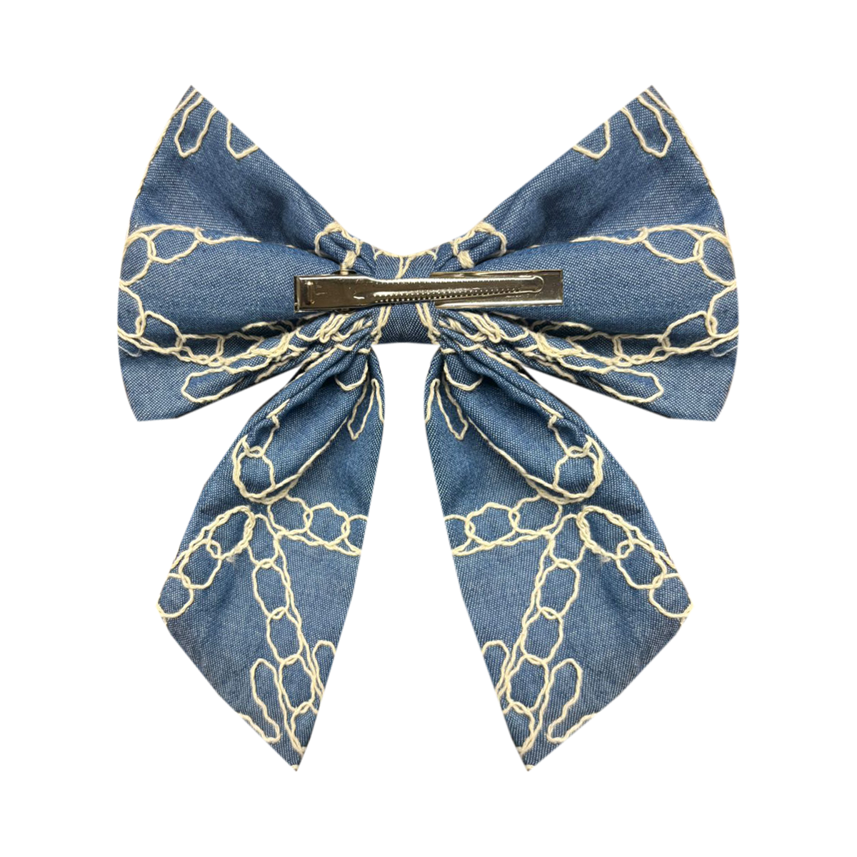 Dale un toque único a tu look con nuestro hermoso moño para el cabello, decorado con un elegante bordado en color beige. Su diseño combina el estilo casual del denim con un detalle sofisticado que lo hace ideal para el día a día ¡El accesorio perfecto para cualquier niña!