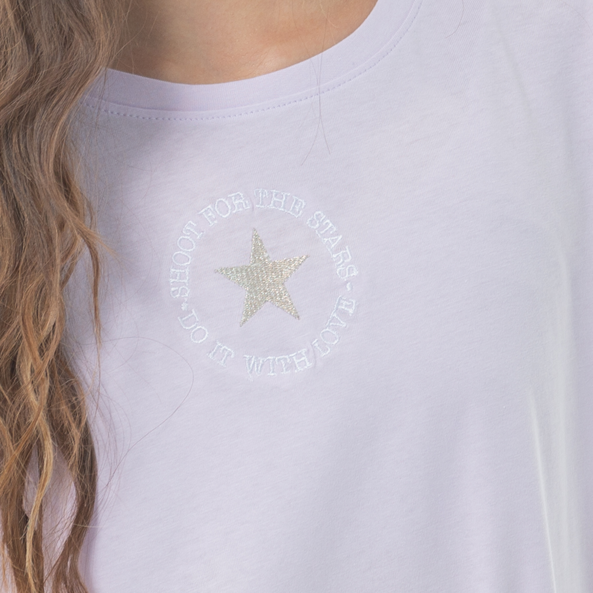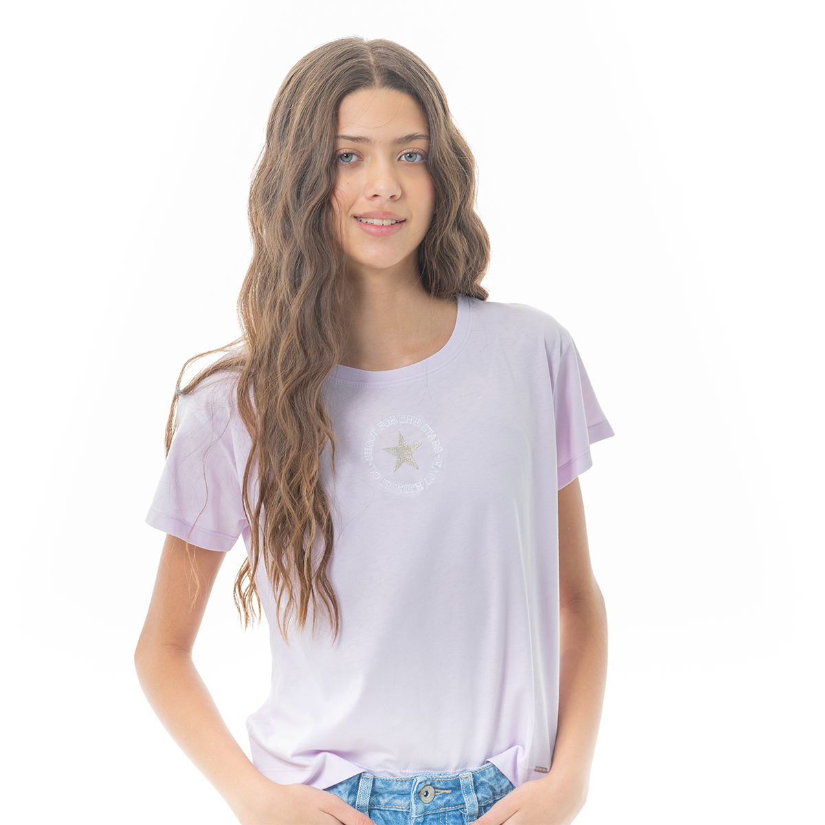 Esta camiseta lila para niña combina comodidad y estilo en una prenda básica con un toque especial. Confeccionada en algodón suave, cuenta con un diseño relajado de corte recto y mangas cortas, ideal para el día a día. En el centro, luce una estrella con brillo y una frase decorativa que añade un detalle moderno y divertido !No te quedes sin tu camiseta Nauty Blue!
