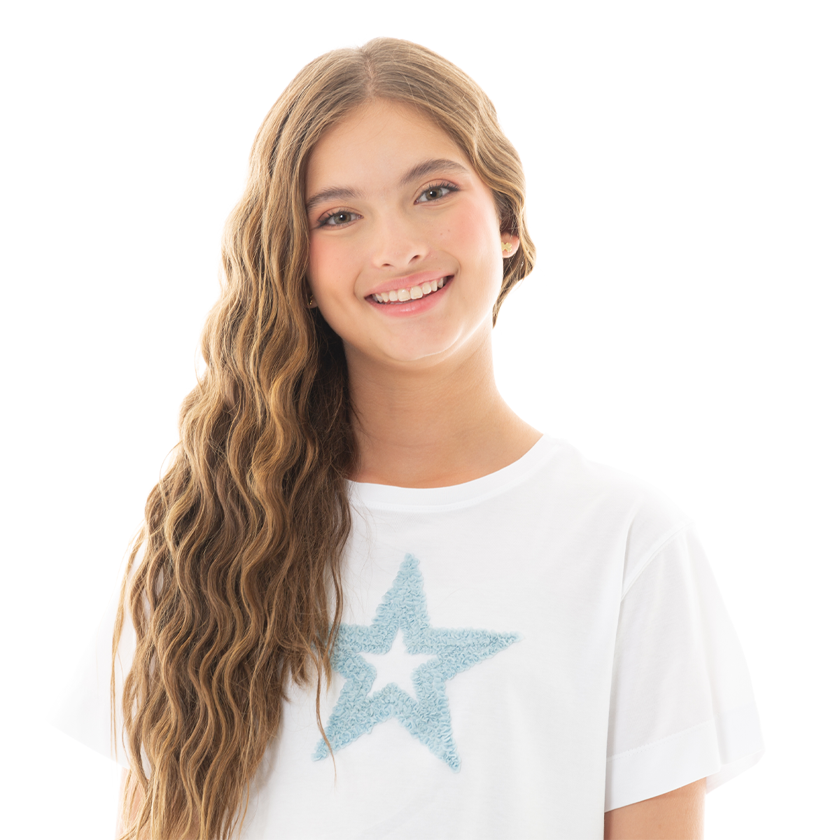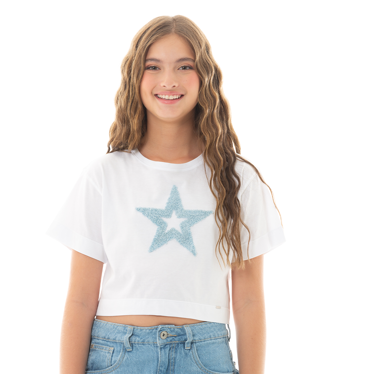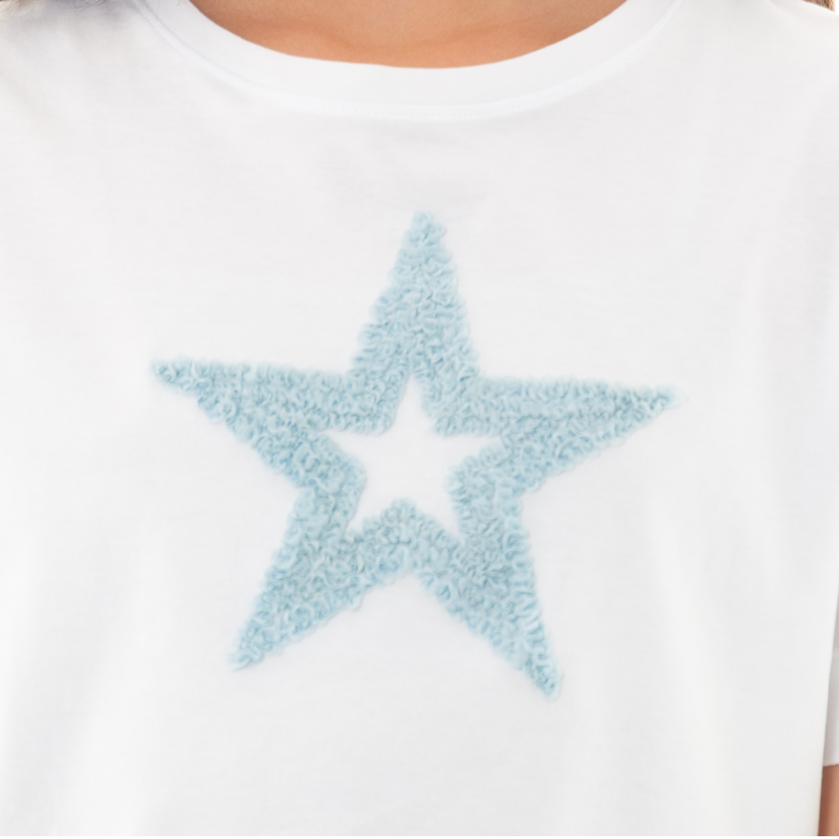 Luce fresca y con estilo con esta camiseta crop top blanca con un llamativo diseño de estrella en aplique de textura suave en color azul celeste. Su estilo juvenil y moderno la convierte en la prenda perfecta para crear outfits cómodos y llenos de personalidad.¡Lúcete con tus camisetas Nauty Blue favoritas!