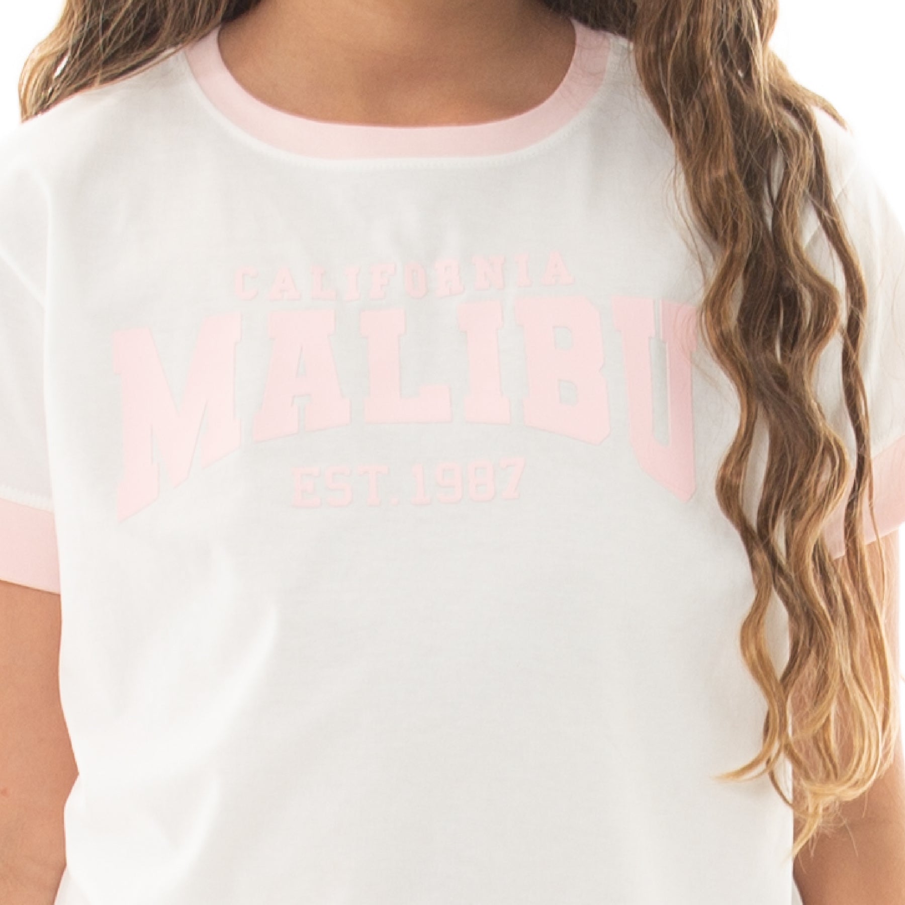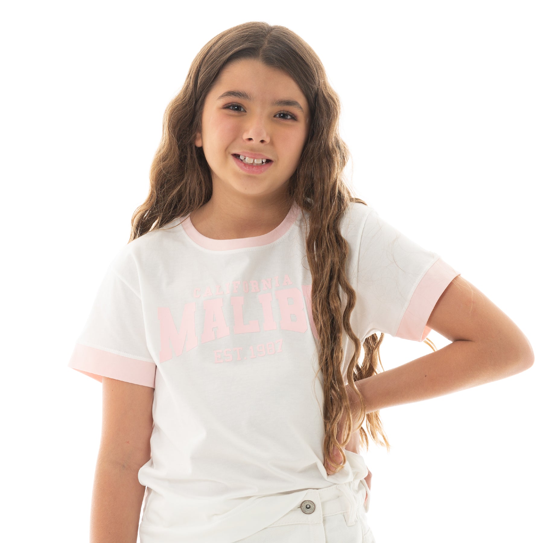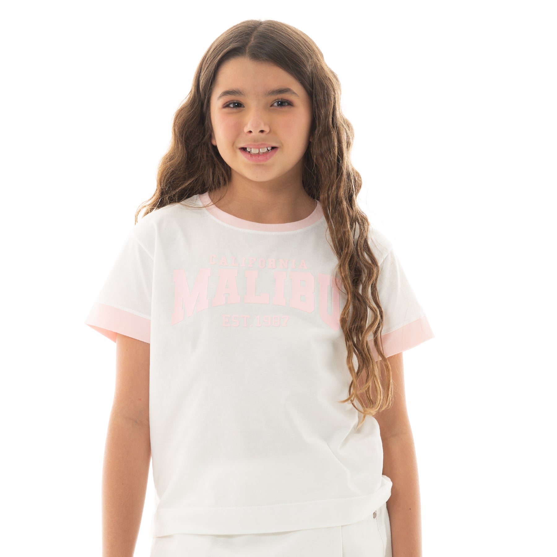 ¡Estilo casual con un toque vintage! Esta camiseta para niñas tiene un diseño clásico inspirado en el estilo universitario. Presenta un estampado en tonos rosa pastel con la inscripción “CALIFORNIA MALIBU EST. 1987”, y detalles en rosa claro en el cuello y las mangas que le dan un contraste encantador🩷. Su tejido suave de algodón garantiza una sensación ligera durante todo el día !No te quedes sin tu camiseta Nauty Blue!