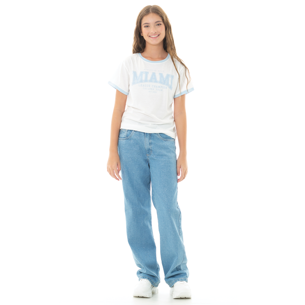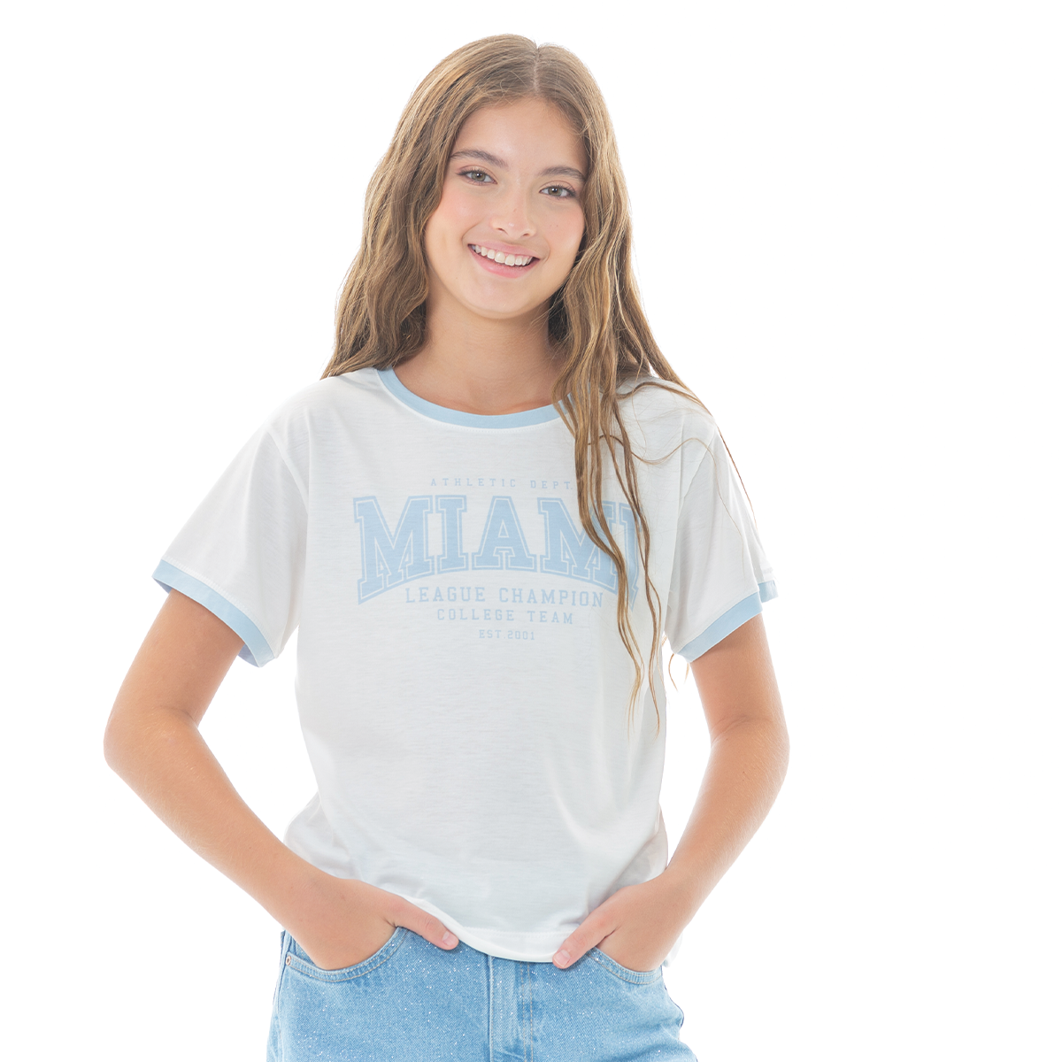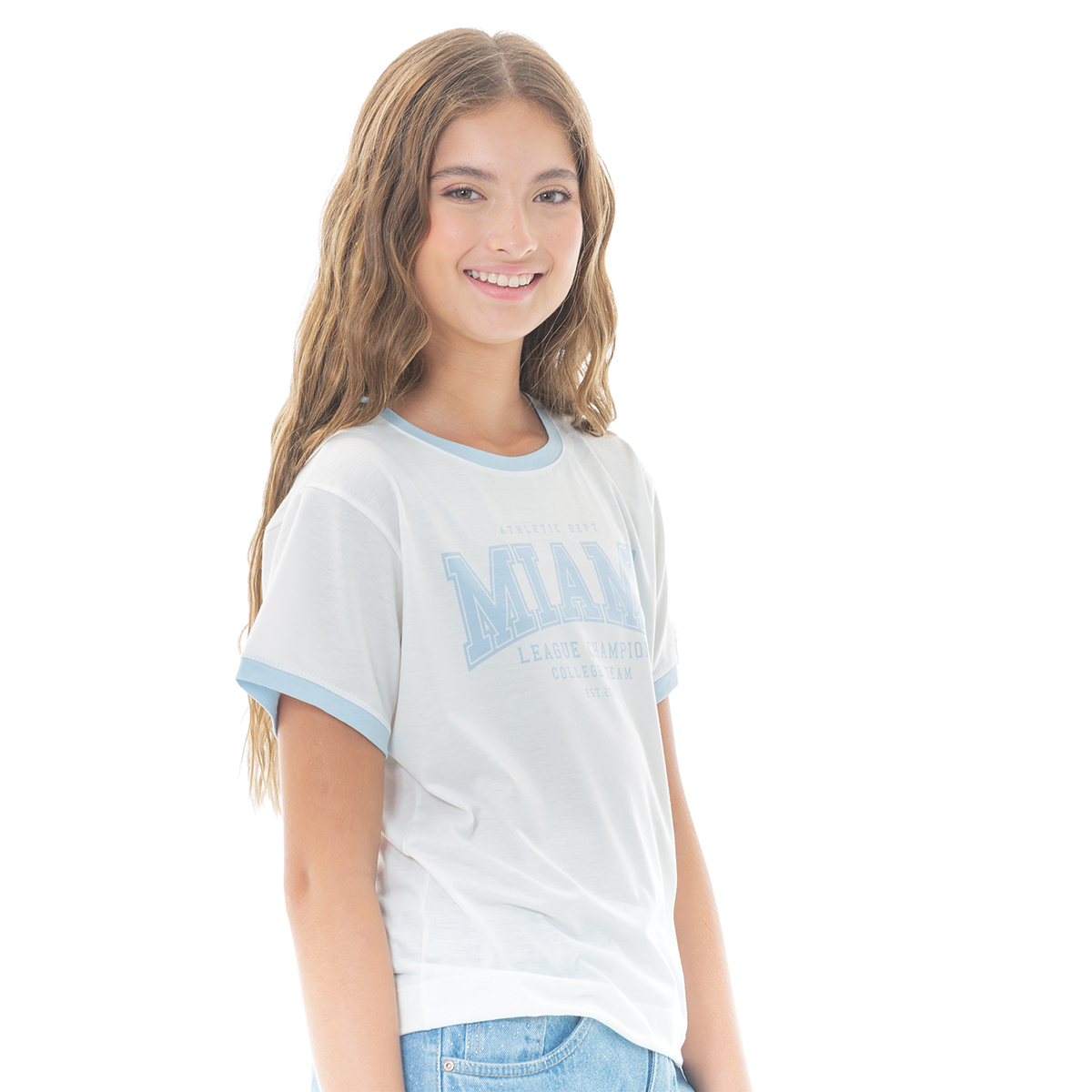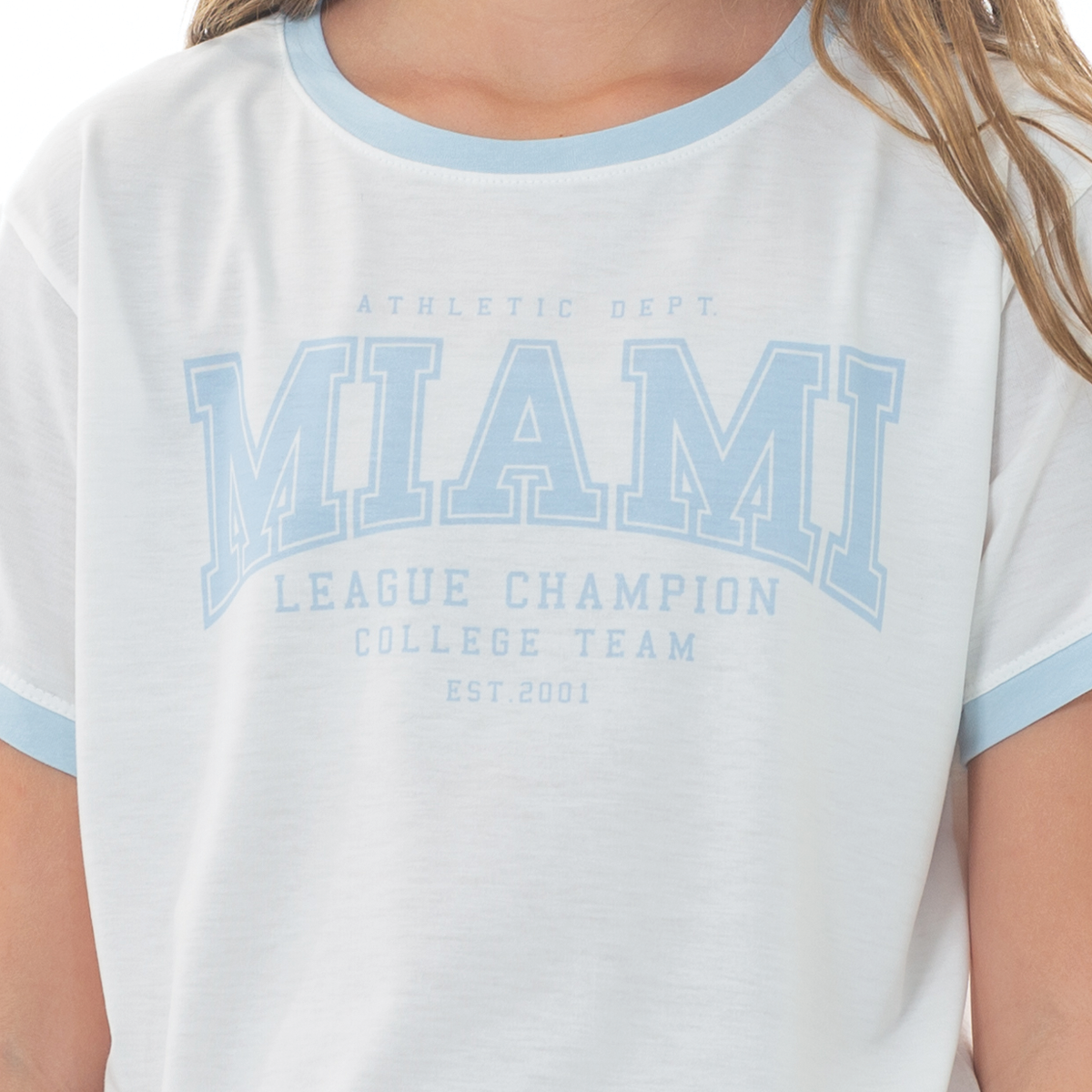 ¡Estilo casual con un toque vintage! Esta camiseta blanca para niña tiene un diseño clásico inspirado en el estilo universitario🩵. Presenta un estampado en tonos azul celestes con la inscripción principal “MIAMI”, y detalles en azul claro en el cuello y mangas que le dan un contraste encantador. Su tejido suave de algodón garantiza una sensación ligera durante todo el día !No te quedes sin tu camiseta Nauty Blue!