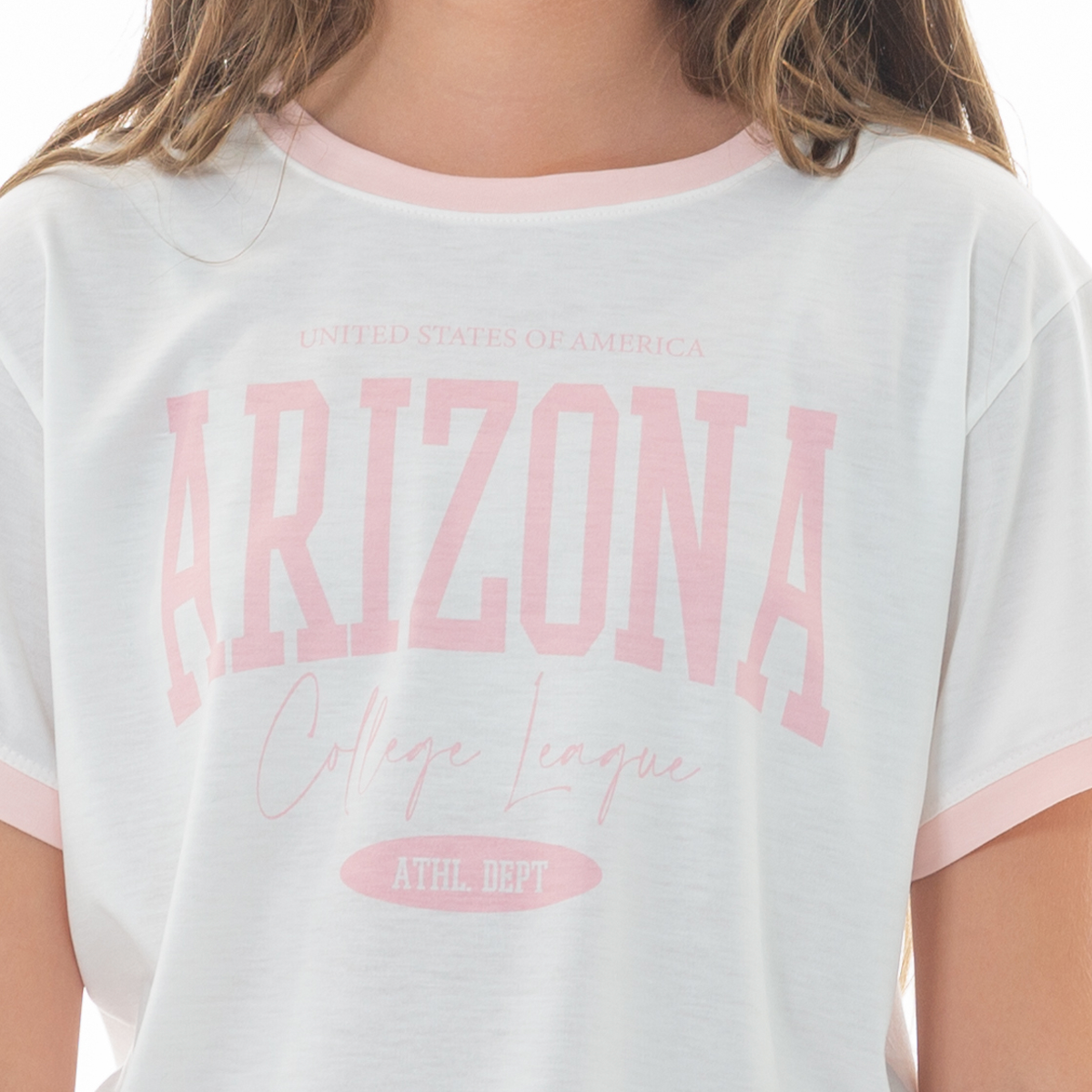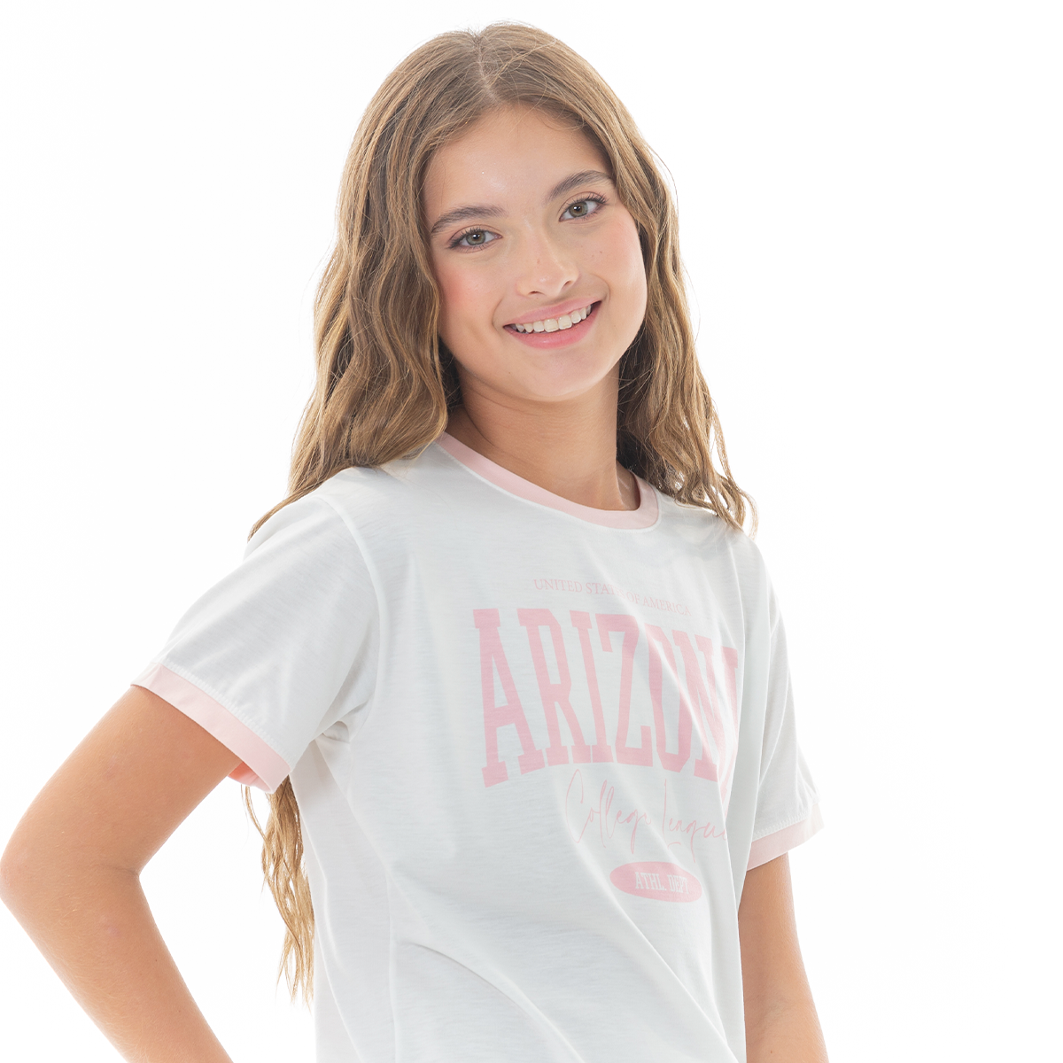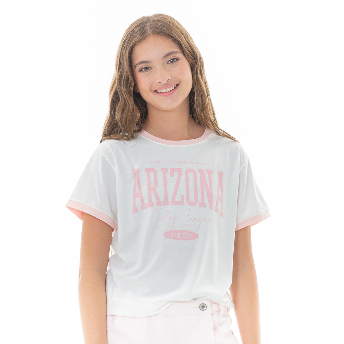 ¡Estilo casual con un toque vintage! Esta camiseta para niñas tiene un diseño clásico inspirado en el estilo universitario. Presenta un estampado en tonos rosa pastel con la inscripción “ARIZONA COLLEGE LEAGUE”, y detalles en rosa claro en el cuello y las mangas que le dan un contraste encantador🩷. Su tejido suave de algodón garantiza una sensación ligera durante todo el día !No te quedes sin tu camiseta Nauty Blue!