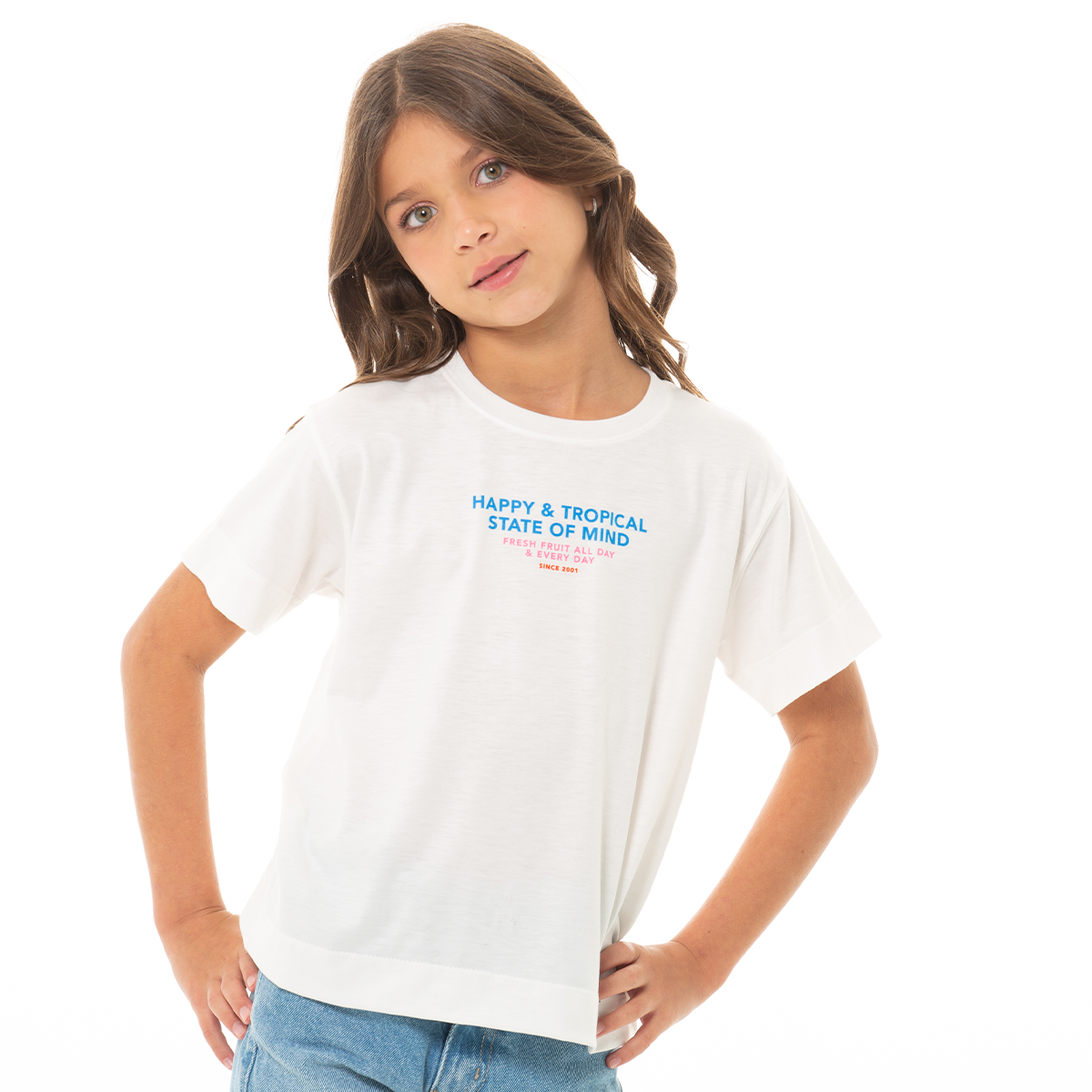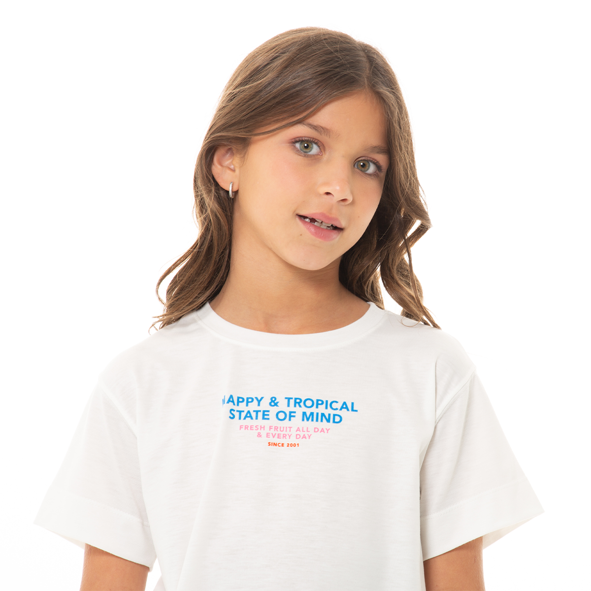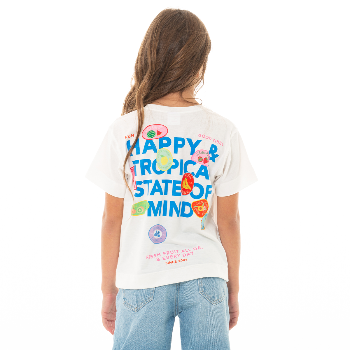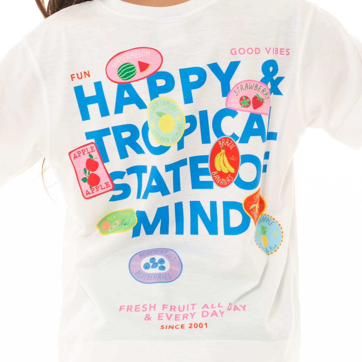 Dale un toque divertido y tropical a tus días con esta camiseta estampada. Su diseño frontal incluye la frase “Happy & Tropical State of Mind”, mientras que en la parte trasera resalta un estampado colorido lleno de frutas tropicales y mensajes positivos que transmiten alegría y frescura. !No te quedes sin tu camiseta Nauty Blue!