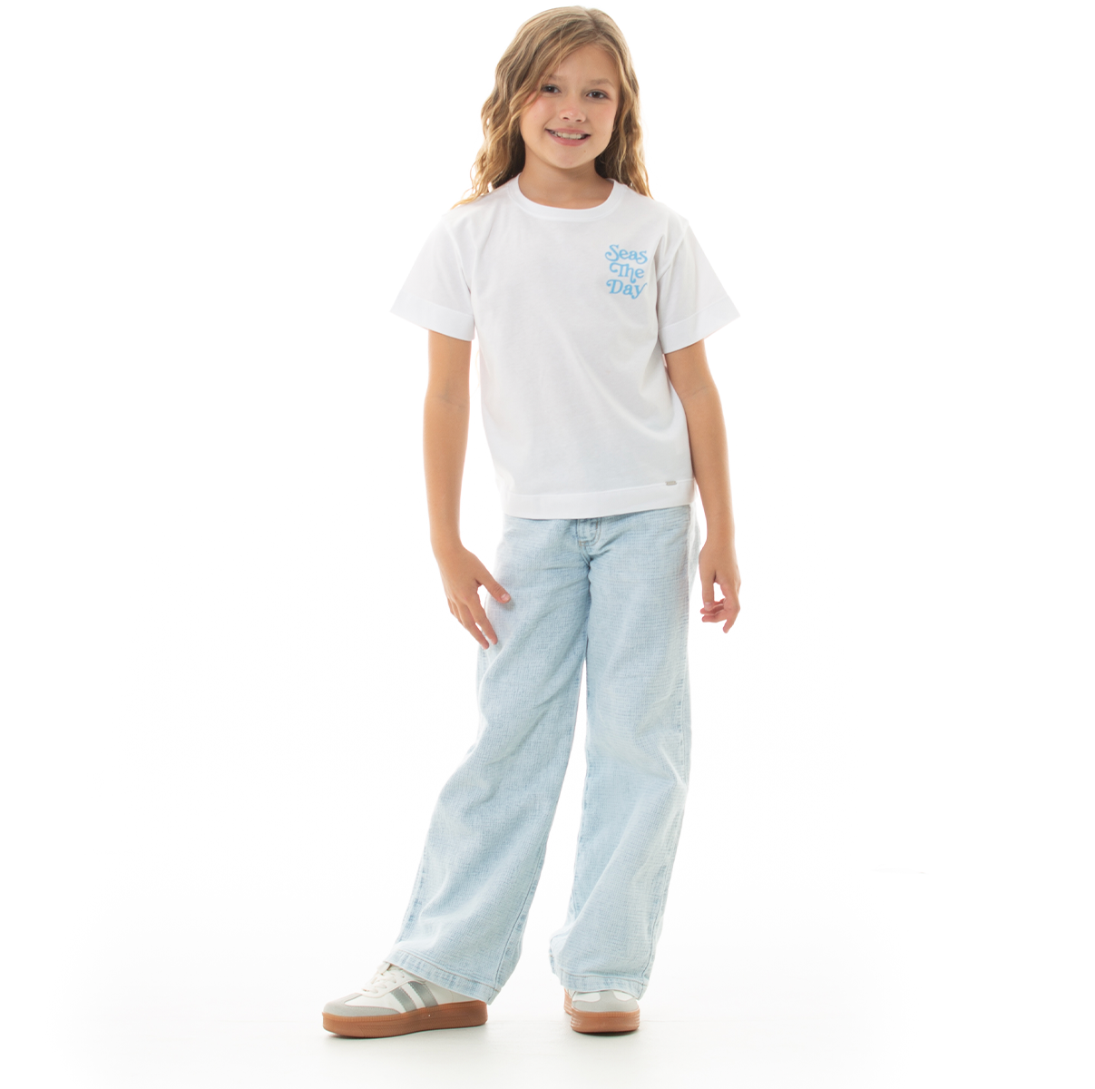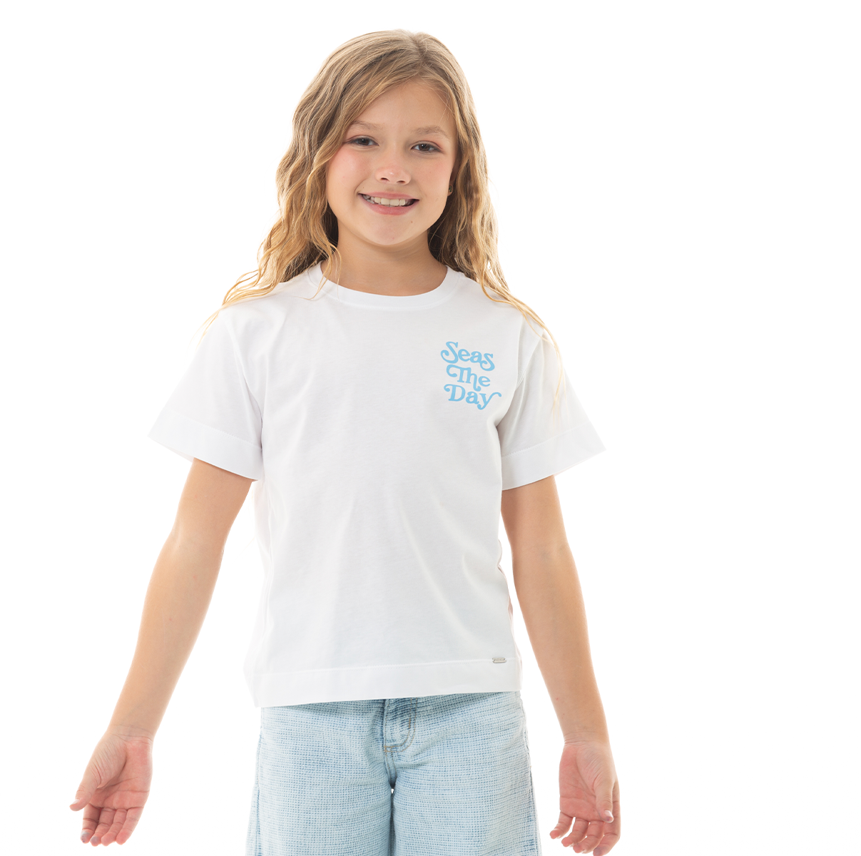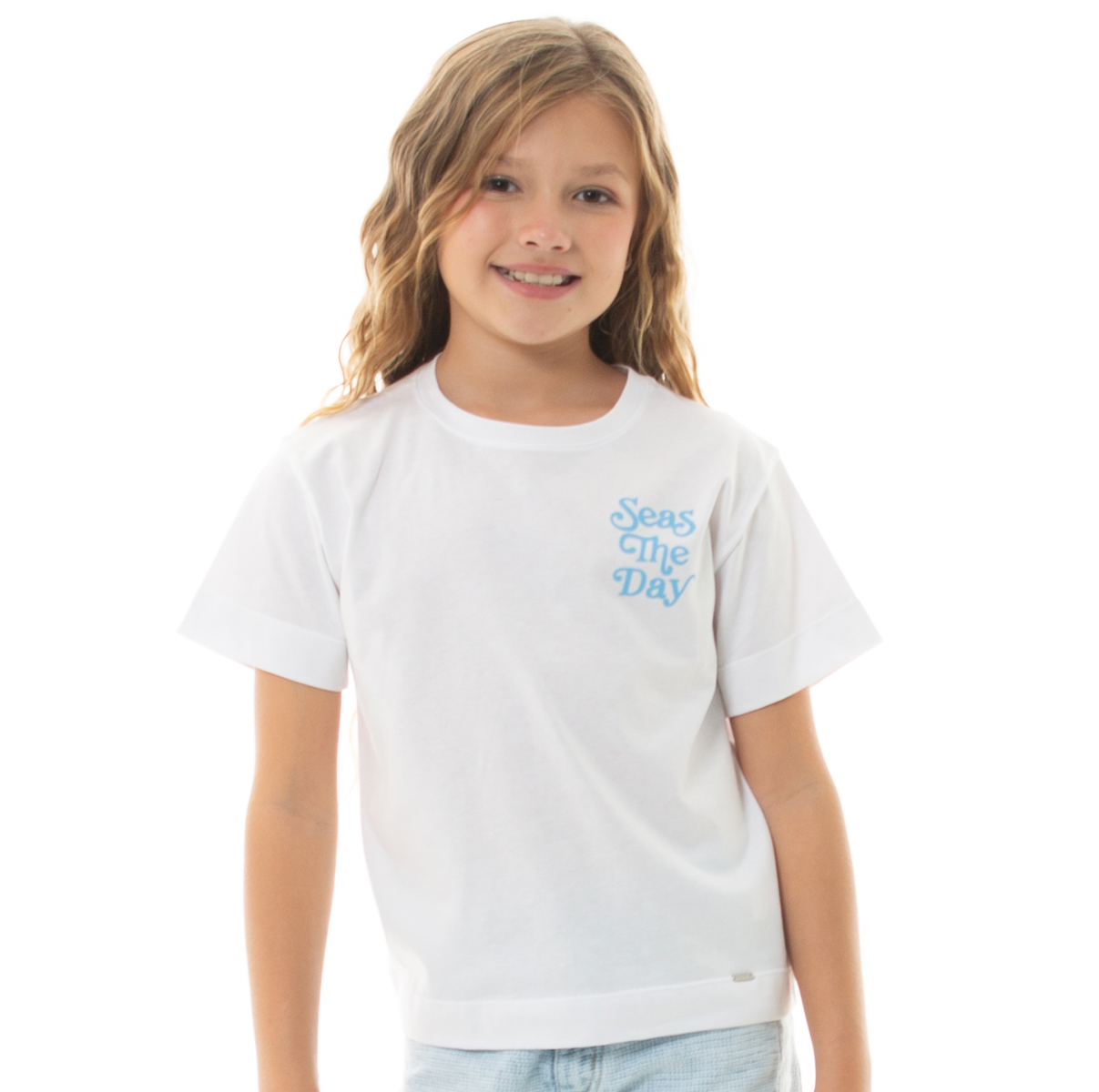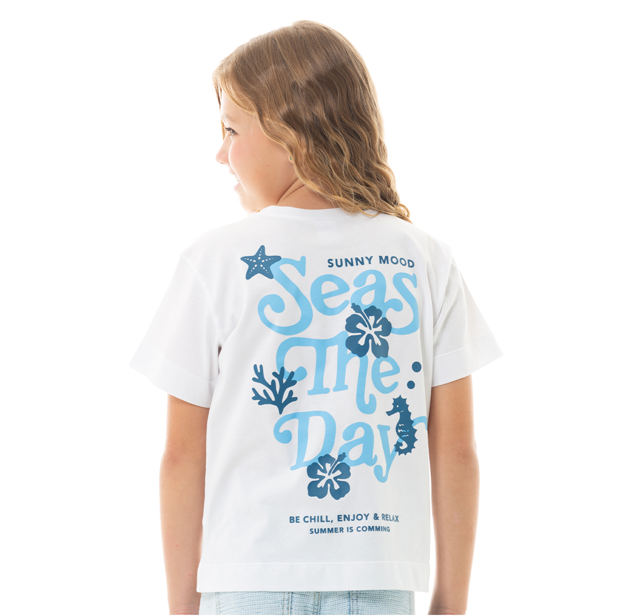 Esta camiseta blanca es un must-have en el armario. Con un delicado estampado "Seas the Day" al frente y en la parte trasera ilustraciones veraniegas como estrellas de mar, flores tropicales, caballitos de mar y corales. !No te quedes sin tu camiseta Nauty Blue!