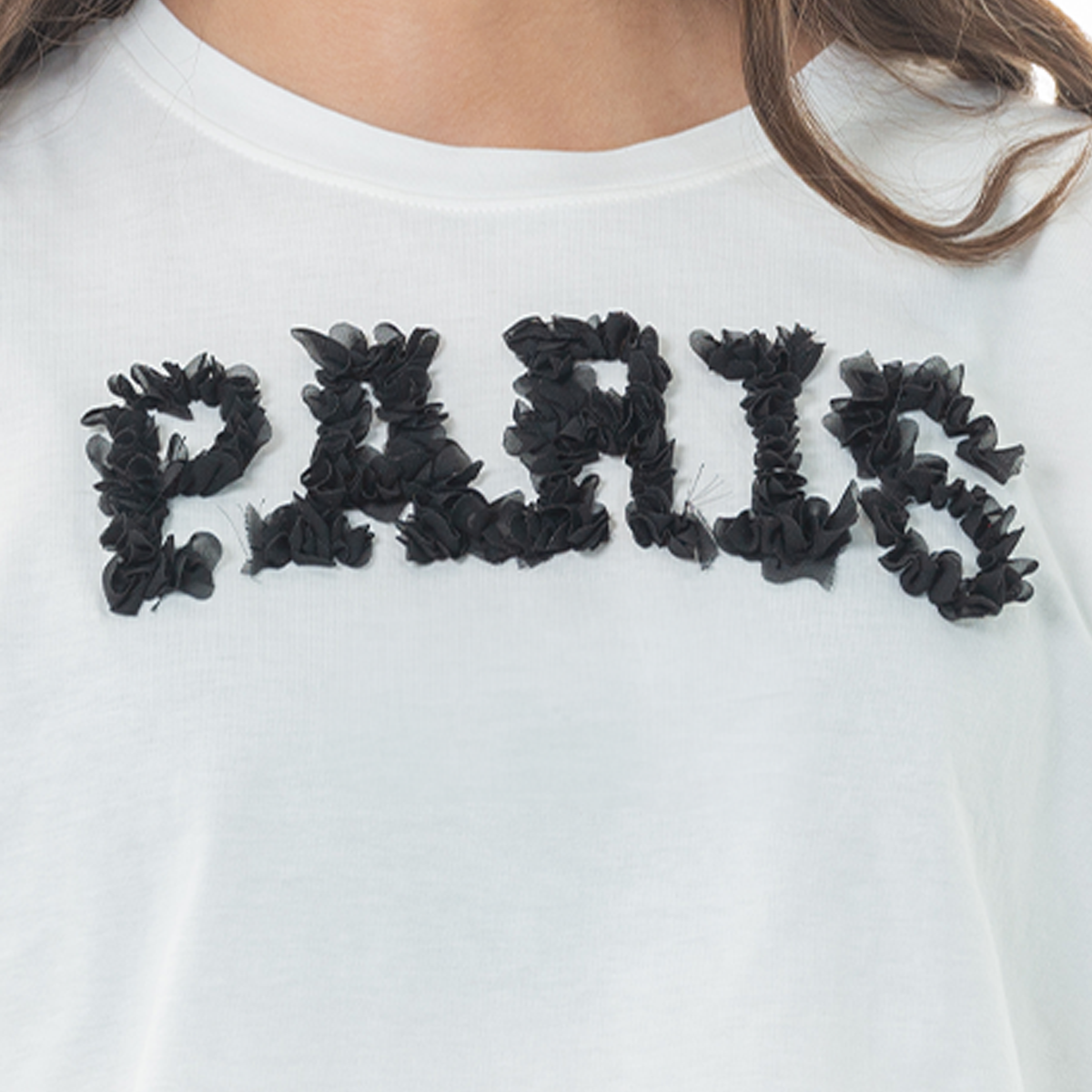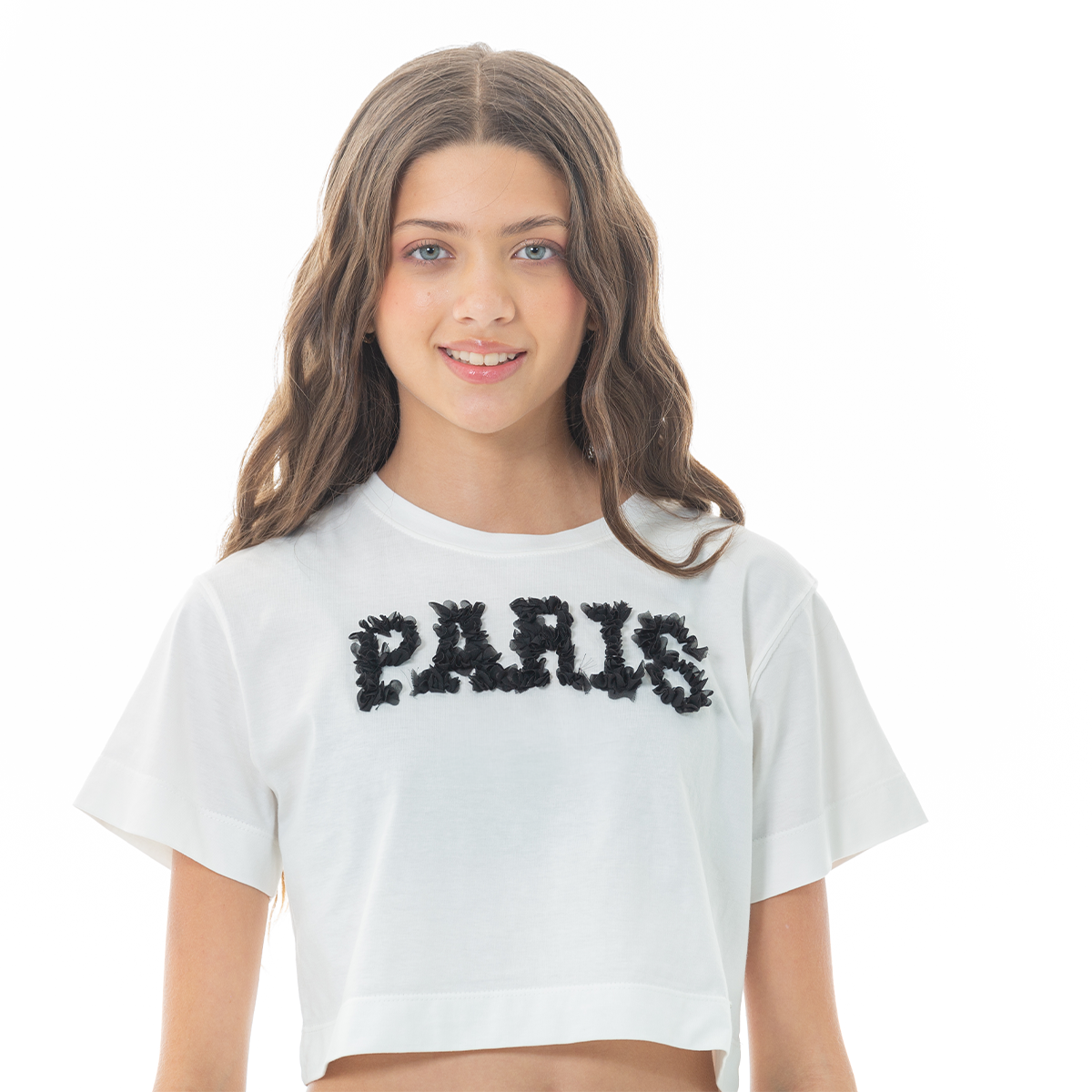 Esta camiseta tipo crop es perfecta para niñas que aman un look moderno y con actitud🖤. Su diseño destaca con un aplique texturizado en color negro que forma la palabra "PARIS", dando un toque chic. Confeccionada en algodón suave y liviano, ofrece comodidad y estilo durante todo el día ¡Perfecta para elevar cualquier outfit!