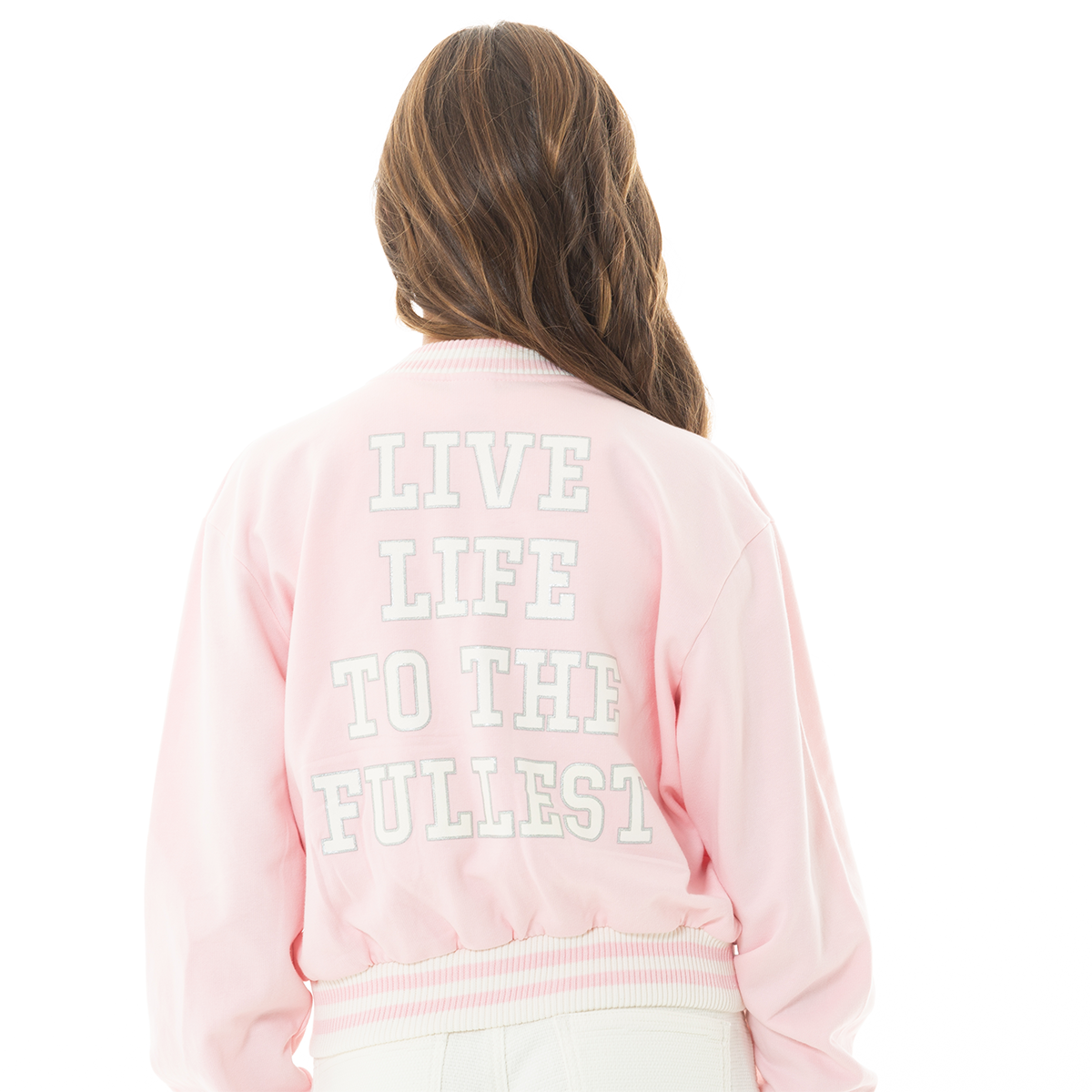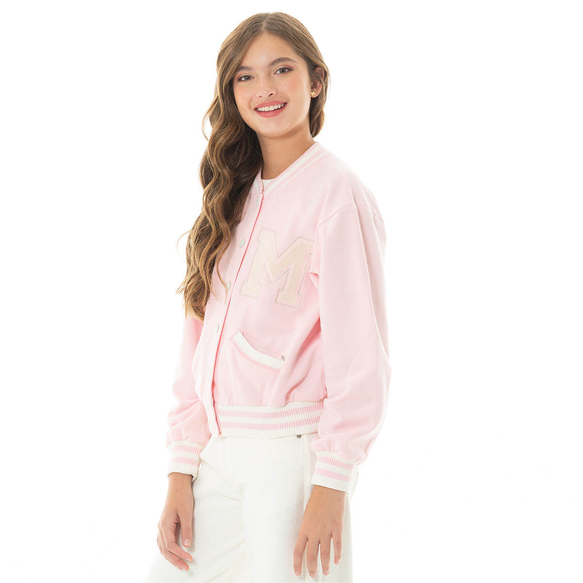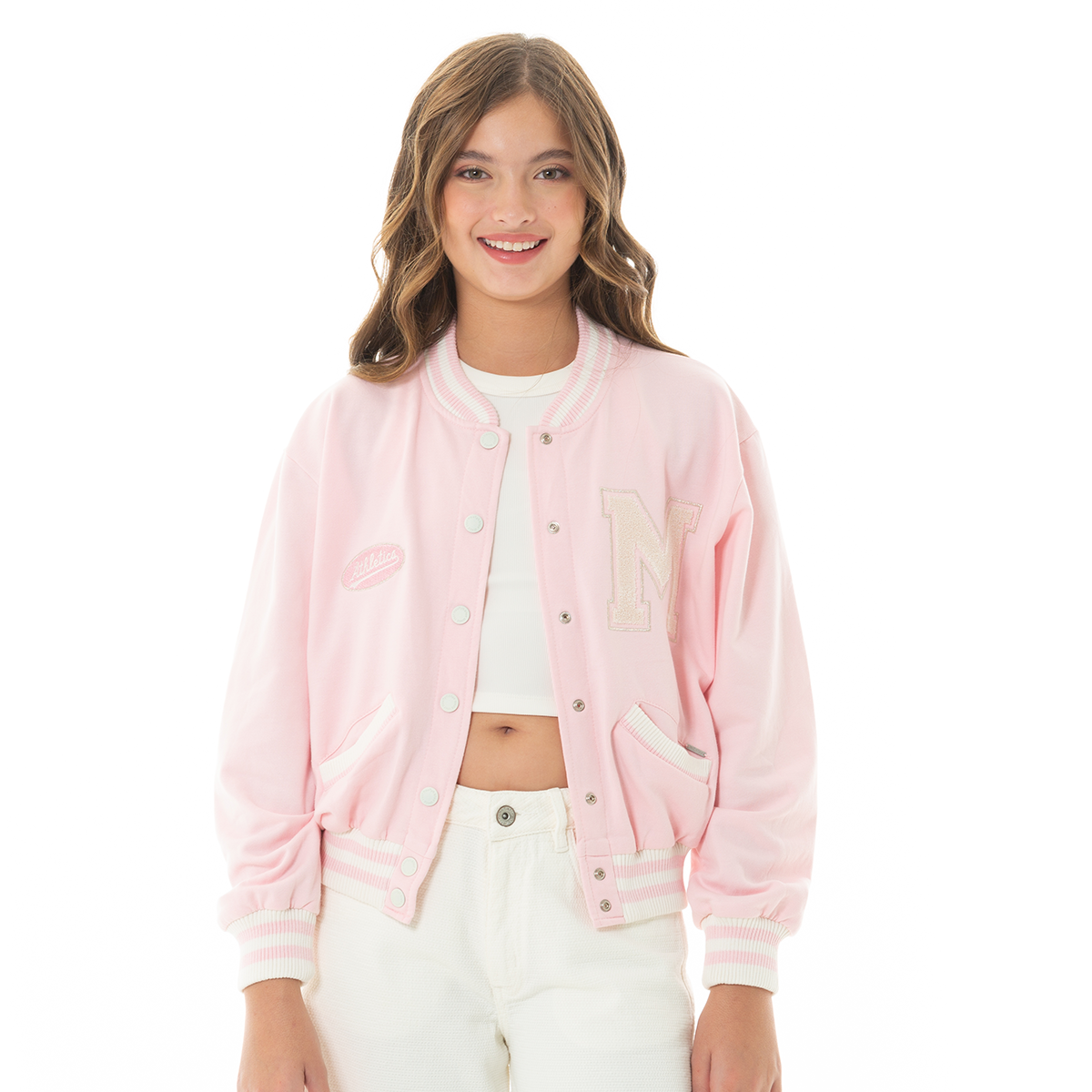 Esta chaqueta tipo varsity es perfecta para las niñas que aman verse con estilo y comodidad. Confeccionada en algodón suave, su diseño en tono rosa pastel aporta un toque tierno y moderno. En la parte frontal luce una letra “M” bordada, mientras que en la espalda destaca la frase “Live Life to the Fullest”, que inspira alegría y actitud positiva ¡Luce hermosa con este outfit!