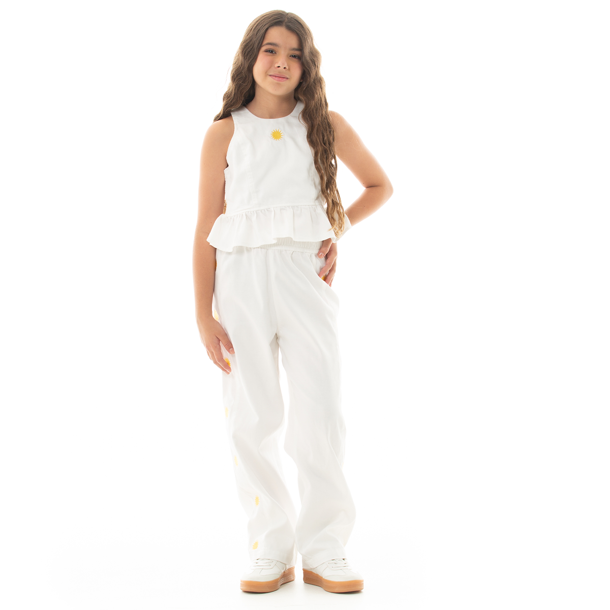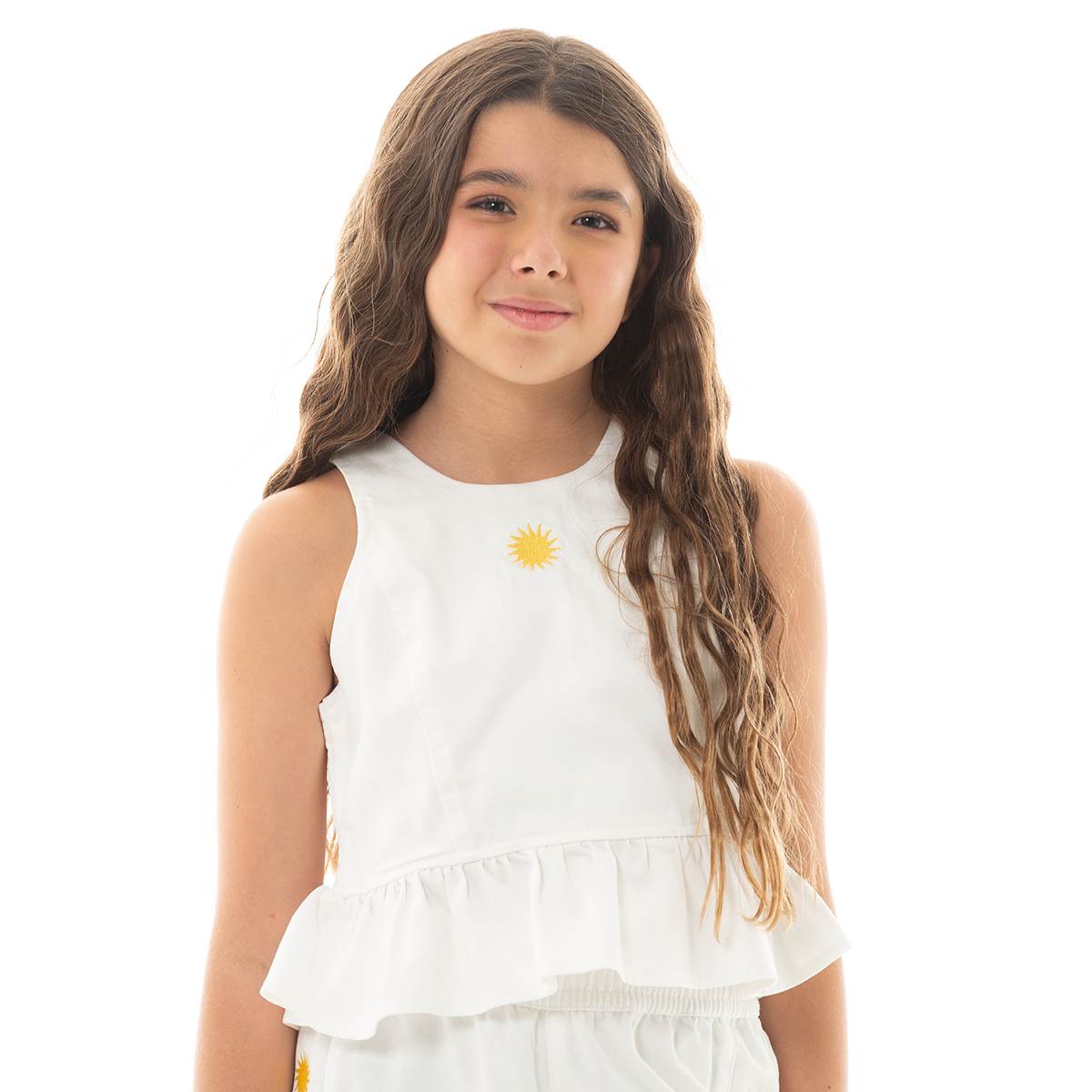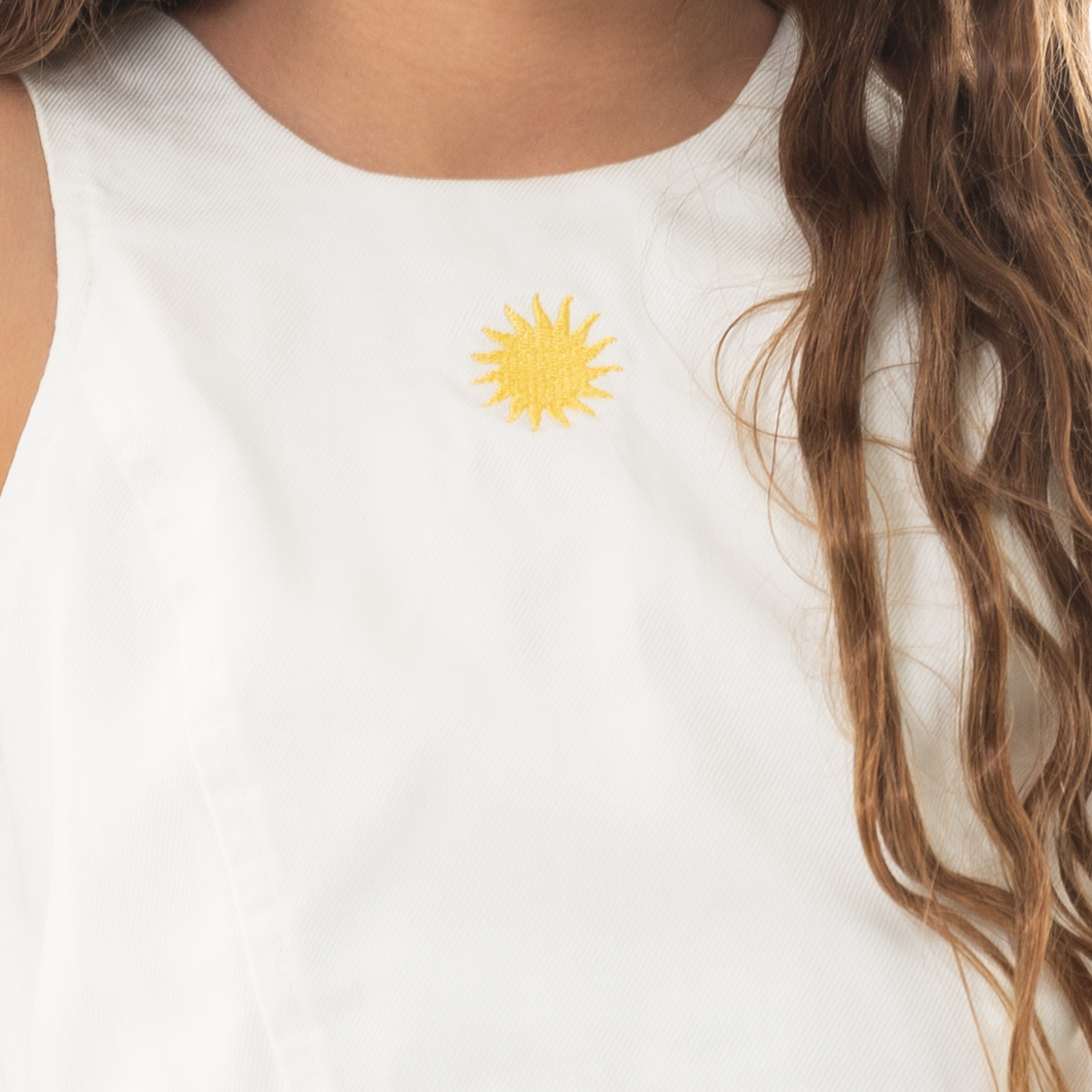 Este encantador crop top es la prenda perfecta para lograr un look fresco, delicado y con estilo. Su detalle principal es su bordado de sol amarillo en la parte frontal 🌞, que aporta un toque distintivo sin perder la elegancia. La silueta presenta un delicado volante en el ruedo que añade movimiento, y un acabado femenino en la espalda con diseño de aberturas y tiras elásticas que crea un look único ¡infaltable para tus outfits Nauty Blue!