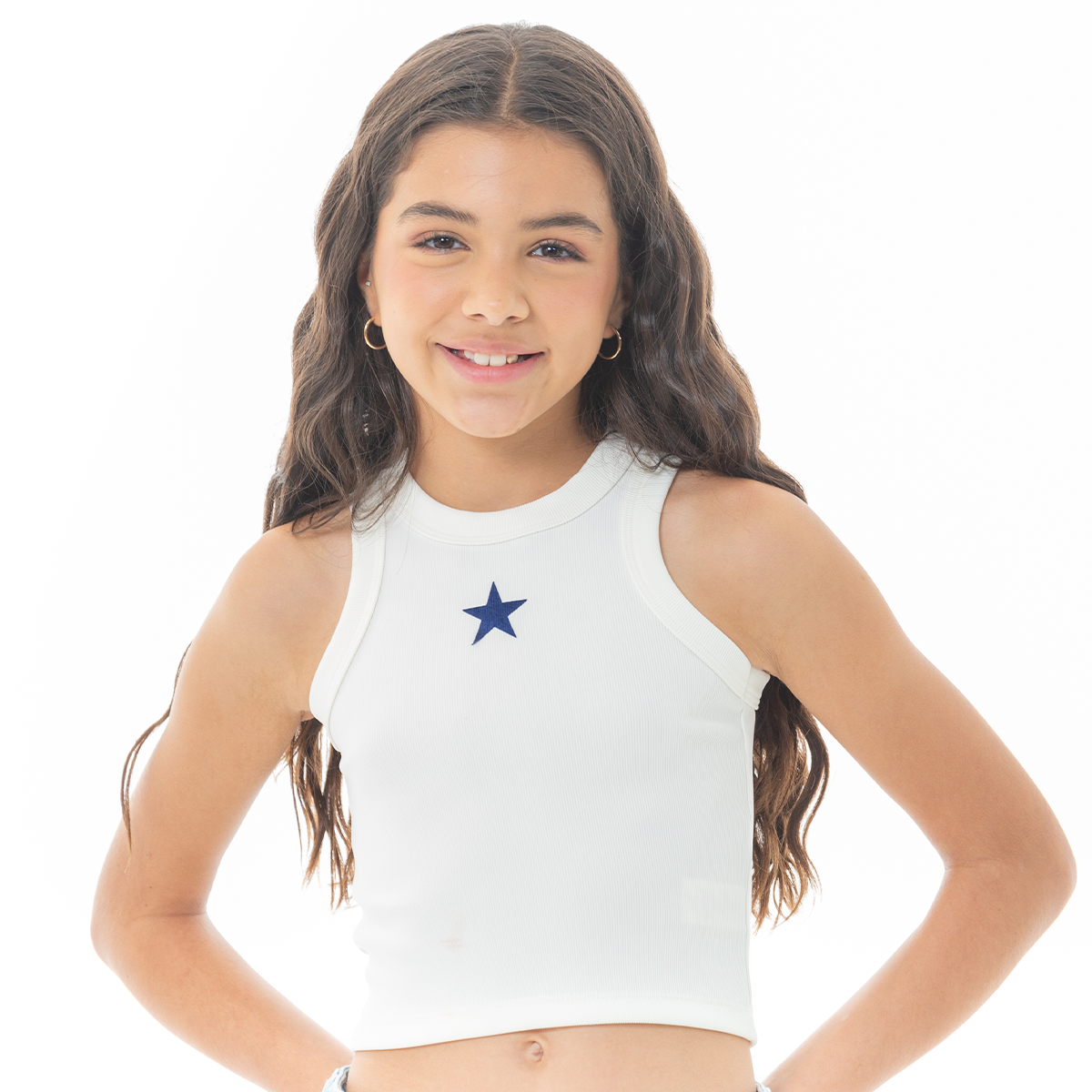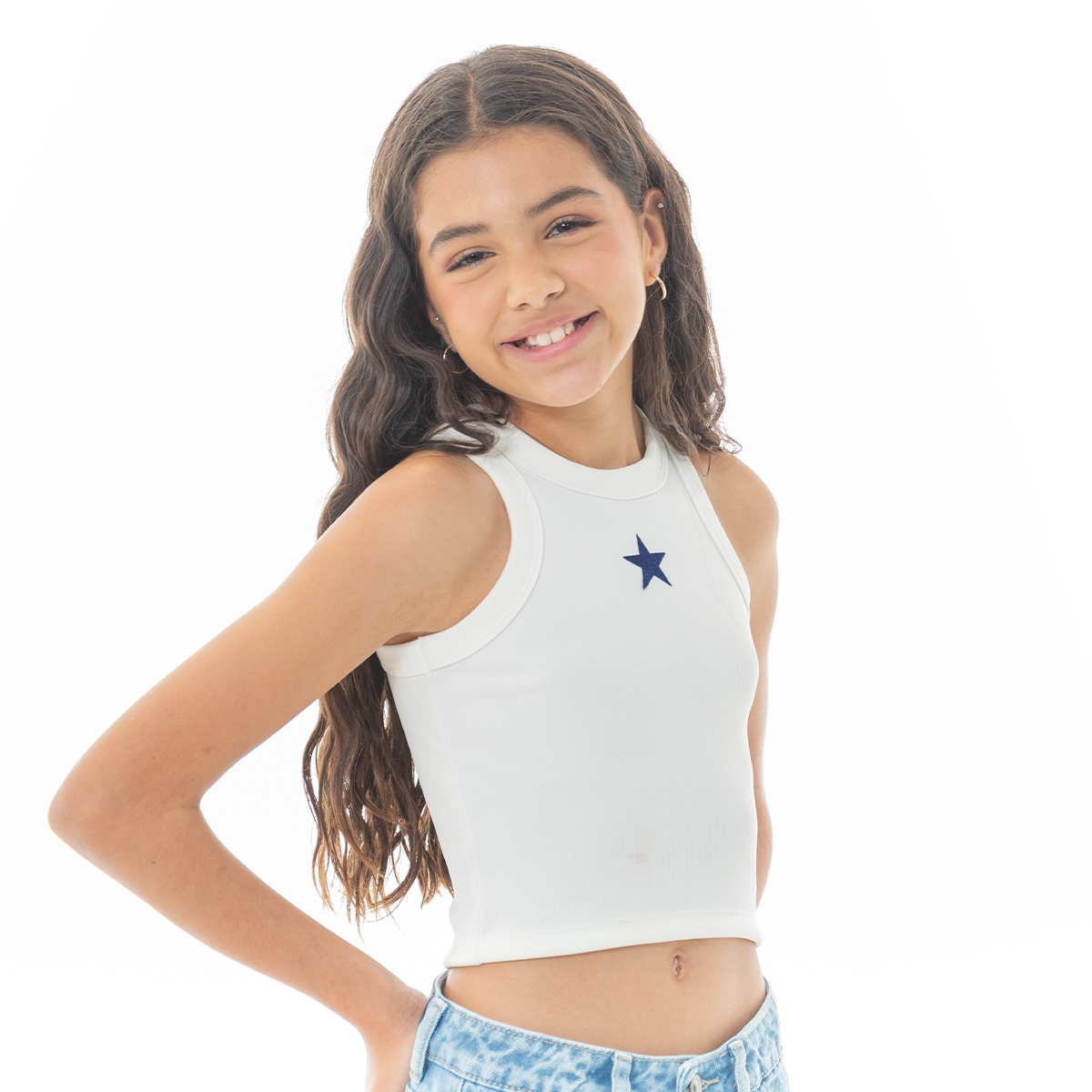 Este crop top sin mangas combina elegancia y estilo en una sola prenda. Confeccionado en tejido acanalado de alta calidad, su diseño ajustado ofrece comodidad y un toque moderno gracias a su diseño de estrella en el centro del pecho ¡Un Básico infaltable para tus outfits Nauty Blue!