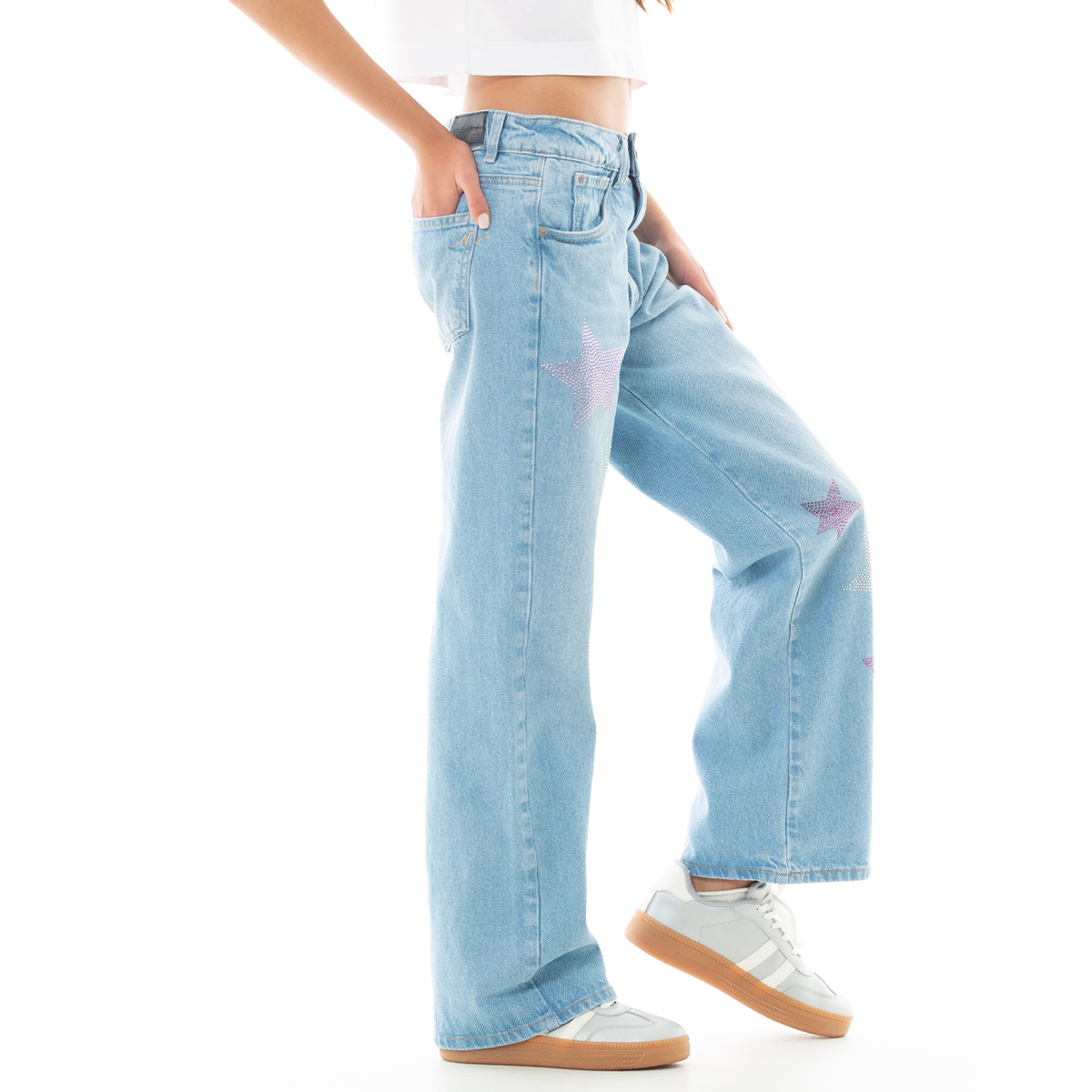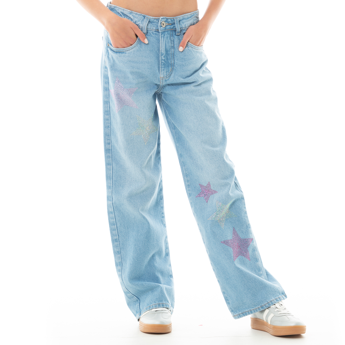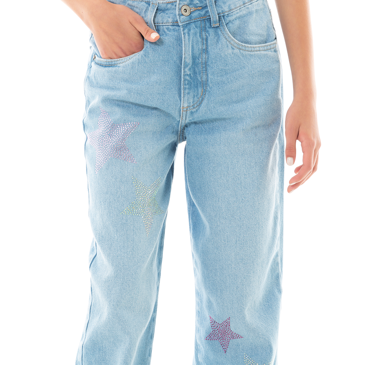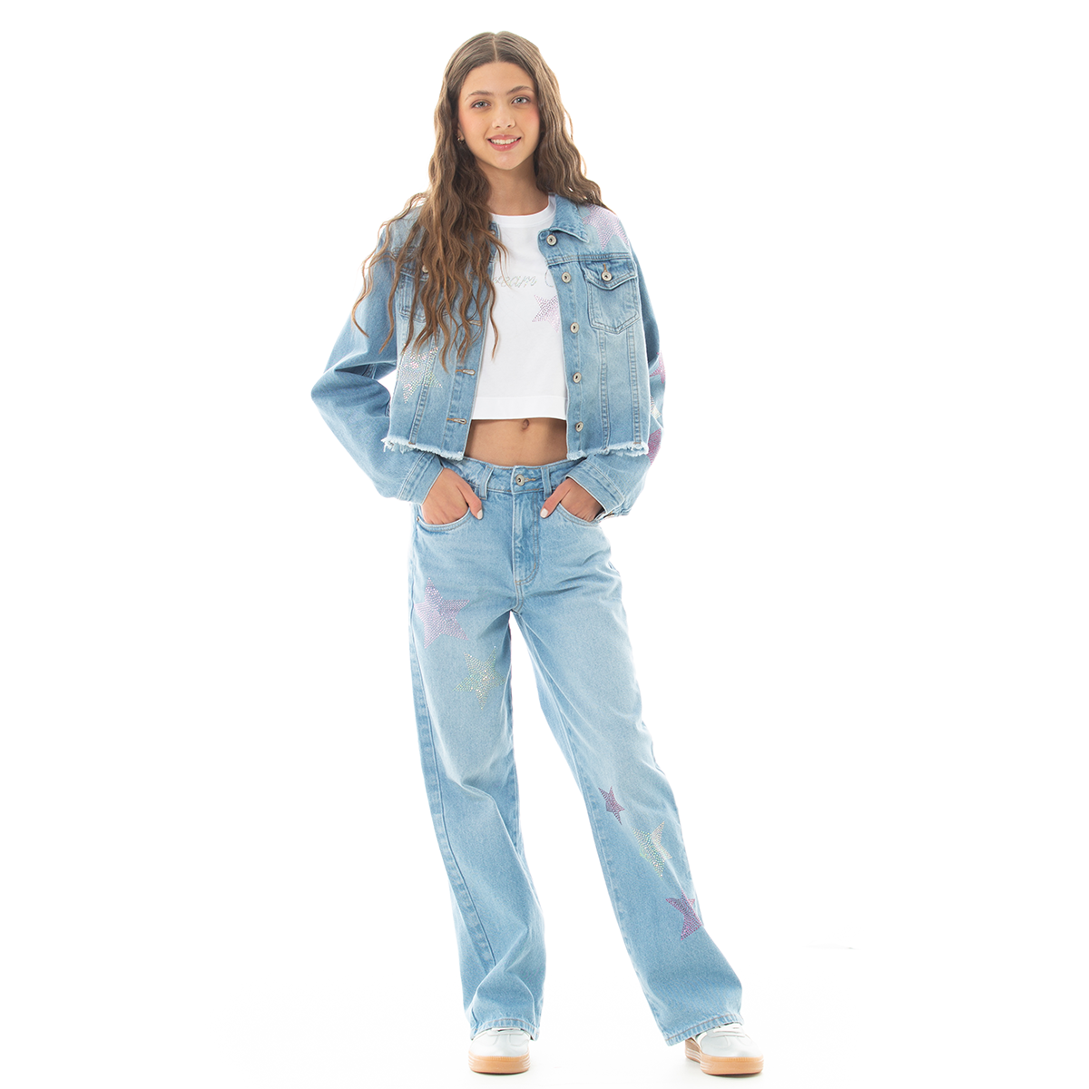 ¡Con mucho estilo y llenos de brillo! 🌟💙 Este jean azul claro es ideal para quienes buscan un look divertido y moderno. Su diseño destaca por las estrellas bordadas con cristales de colores, que le aportan un toque único y brillante. El denim es suave, cómodo y con una silueta amplia tipo wide leg, perfecto para todo tipo de ocasiones casuales ¡Un básico con mucho carácter para los outfits más cool!