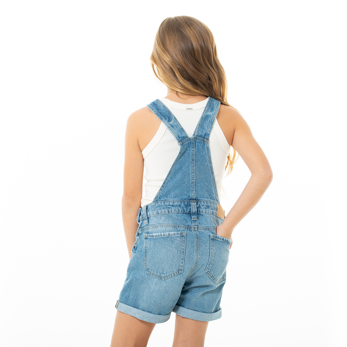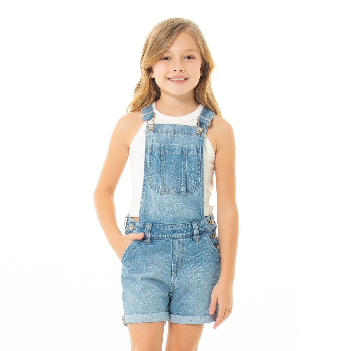 Este adorable overol short en denim para niña es una prenda versátil, moderna y llena de estilo🌟. Su diseño clásico tipo jardineras se complementa con un delicado efecto brillante en la tela, que lo convierte en una opción ideal para looks casuales, divertidos y con un toque especial ¡Será tu preferido!
