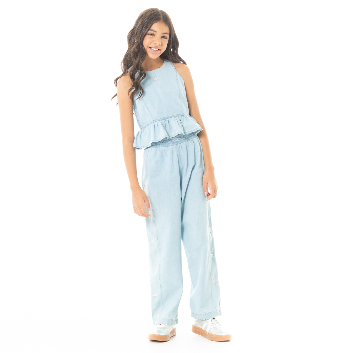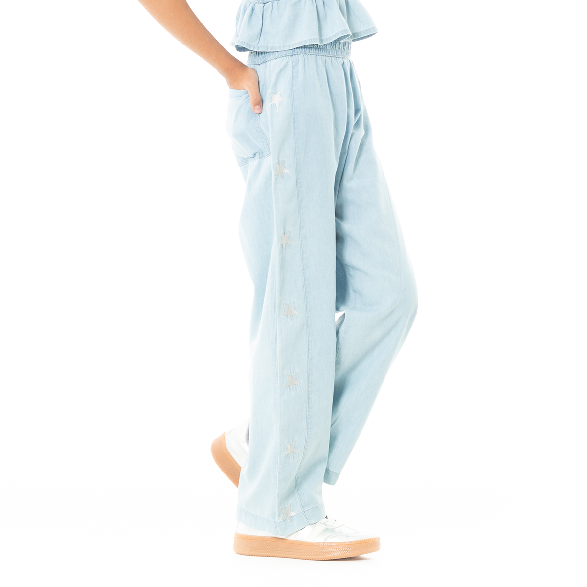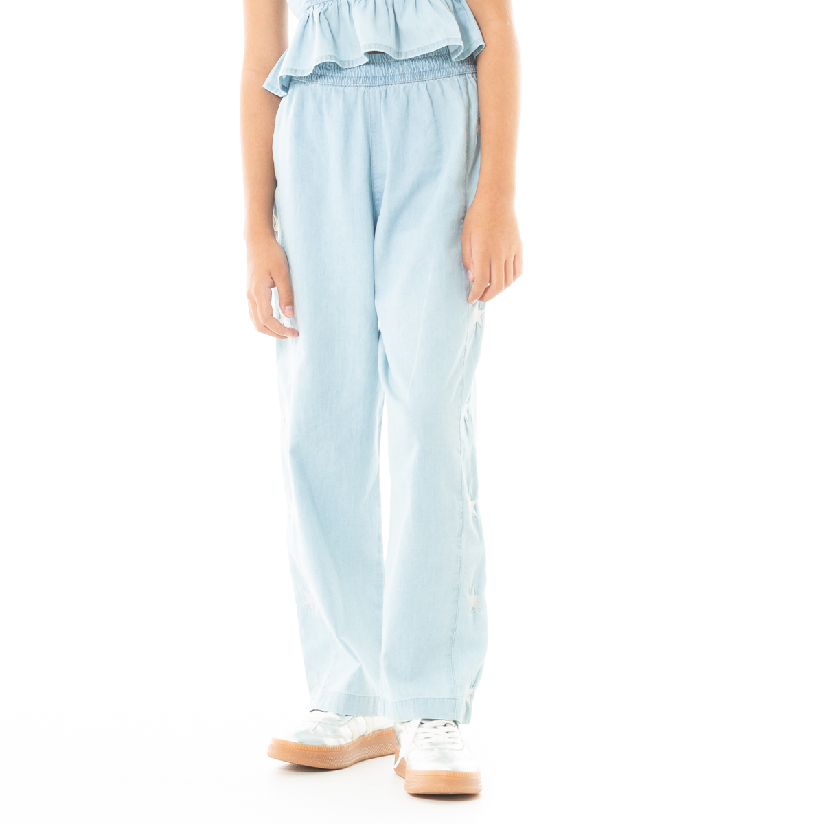 Este pantalón azul cielo combina frescura, estilo y comodidad en una sola prenda💙. Confeccionado en una tela de mezclilla ligera y suave, ofrece un ajuste relajado que permite moverse con total libertad sin perder ese toque moderno que encanta. Su detalle más especial y encantador son sus estrellas bordadas en color plateado a lo largo de las costuras laterales, un diseño delicado y lleno de magia ¡Luce hermosa con este outfit!