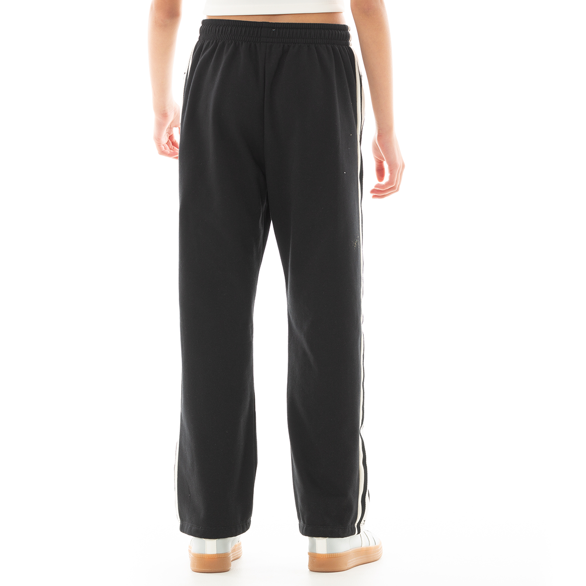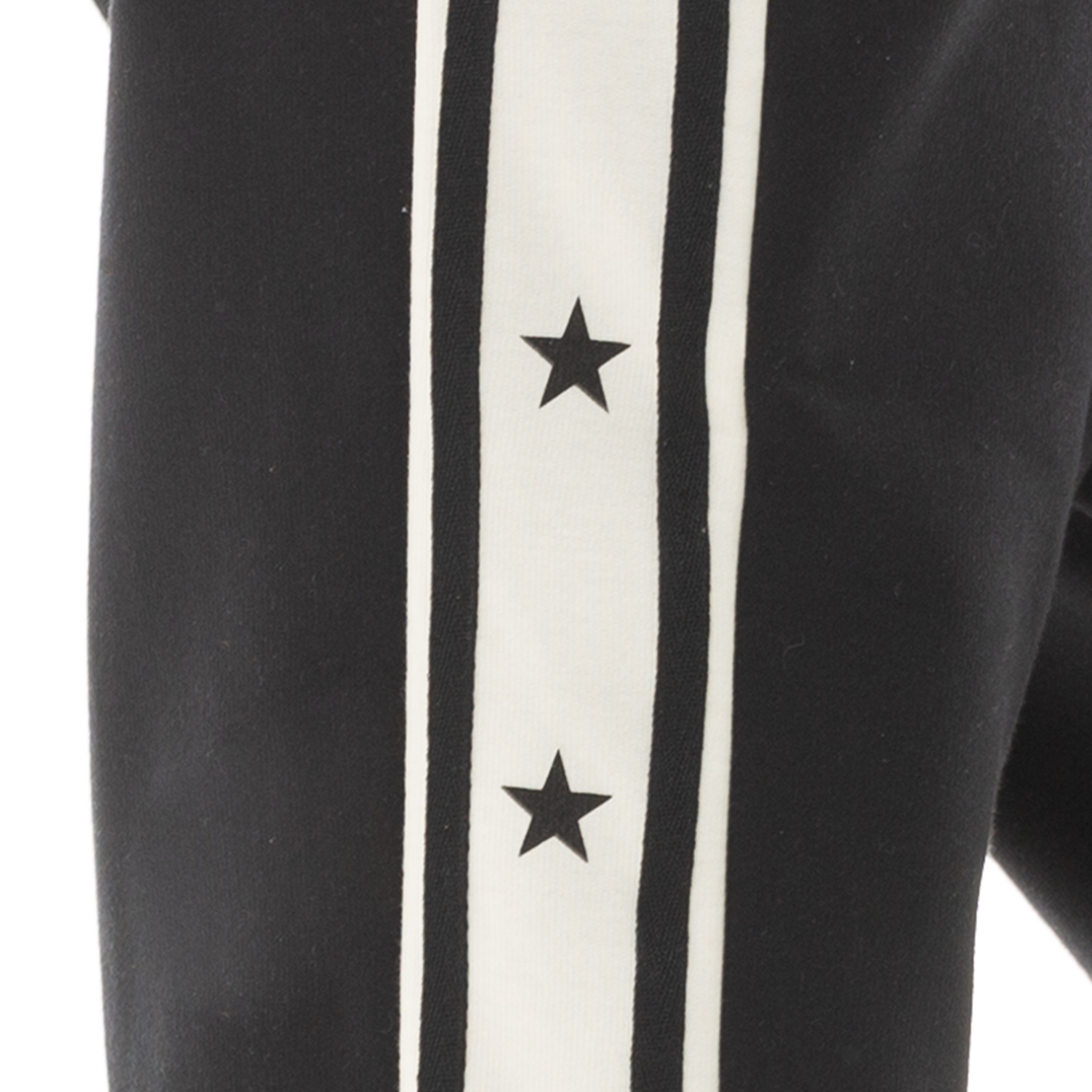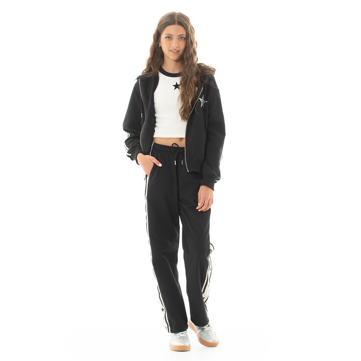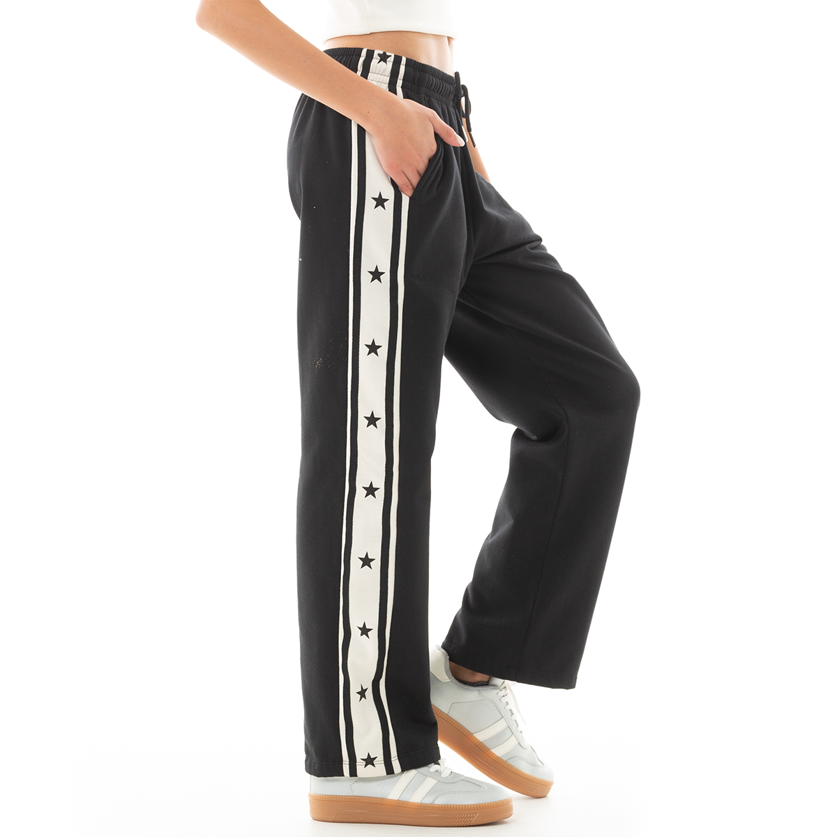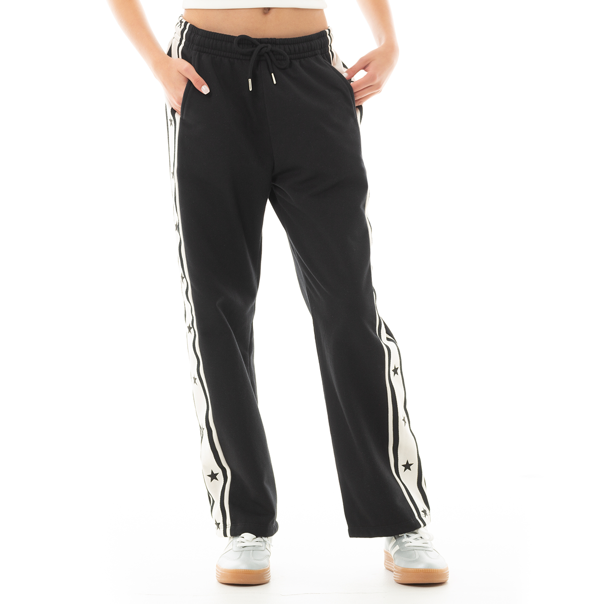 ¡Comodidad y estilo para cada día! 🖤 Esta sudadera combina comodidad y estilo, presenta un diseño moderno en color negro con franjas laterales blancas decoradas con estrellas negras, aportando un toque distintivo y atrevido. Su cintura elástica con cordón ajustable garantiza un calce perfecto, mientras que los bolsillos laterales ofrecen practicidad para el día a día. ¡Ideal para crear looks modernos y femeninos!