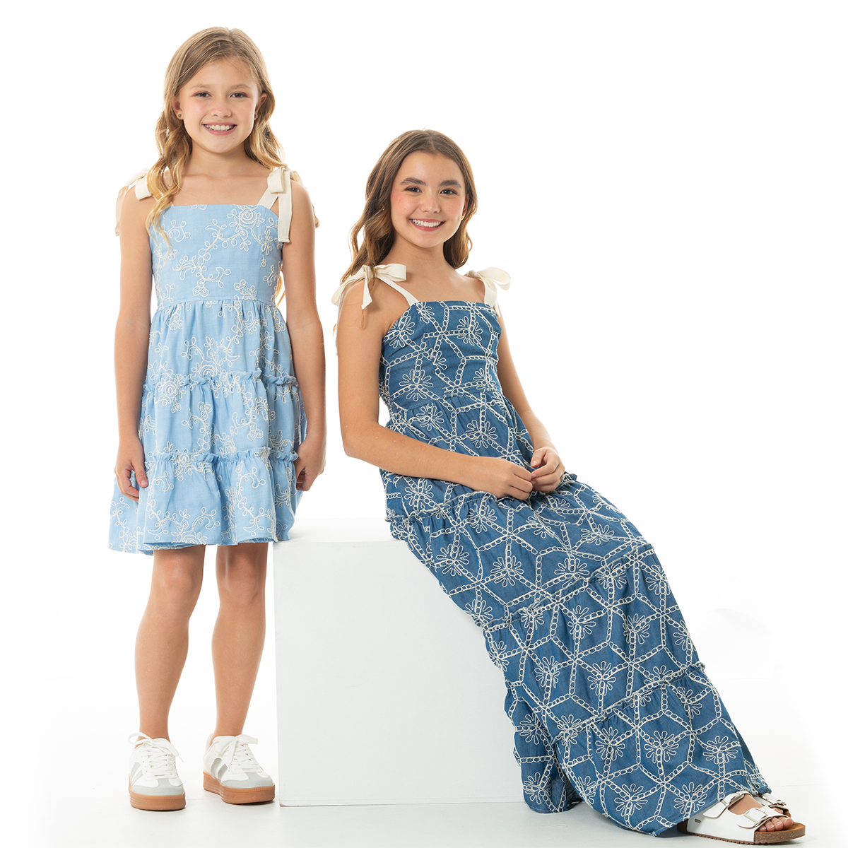 Este vestido largo para niñas destaca por su combinación de frescura y elegancia, proporcionando un equilibrio perfecto entre estilo y confort. Confeccionado en una tela azul de textura suave que presenta un bordado blanco en relieve con motivos geométricos y florales que aporta un acabado artesanal distintivo y sofisticado. ¡Luce hermosa con este outfit!