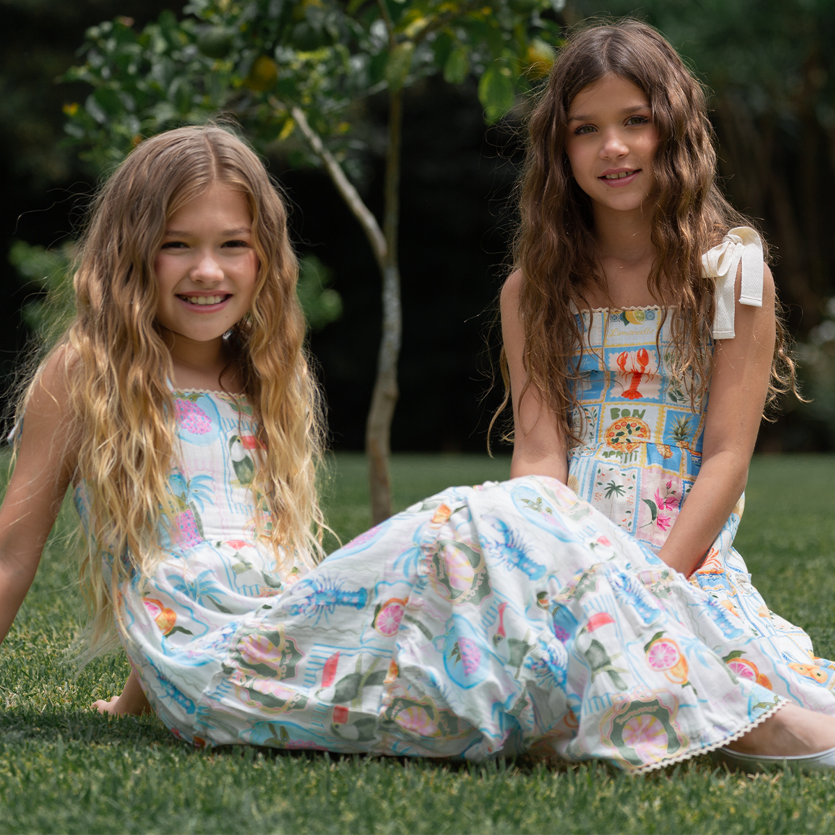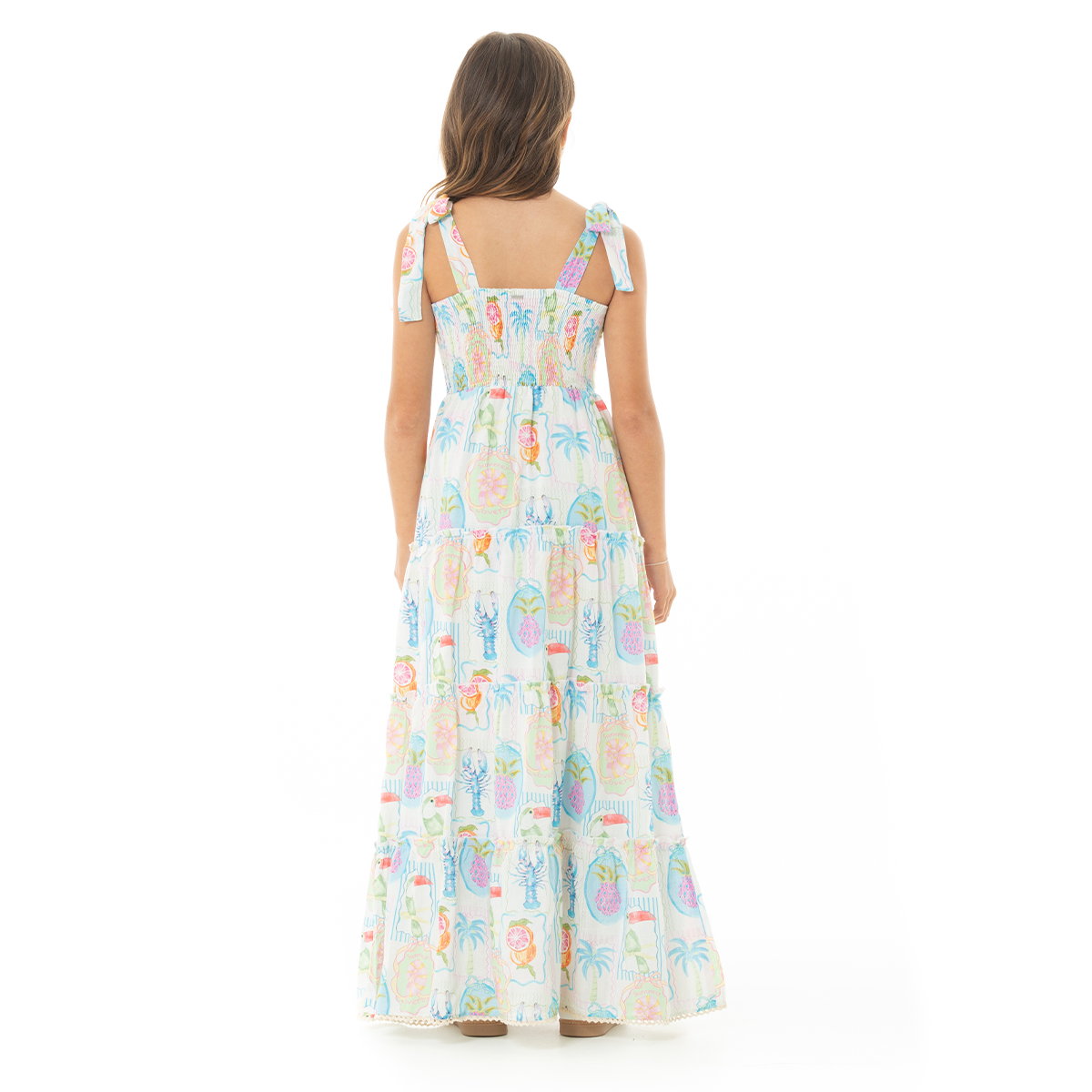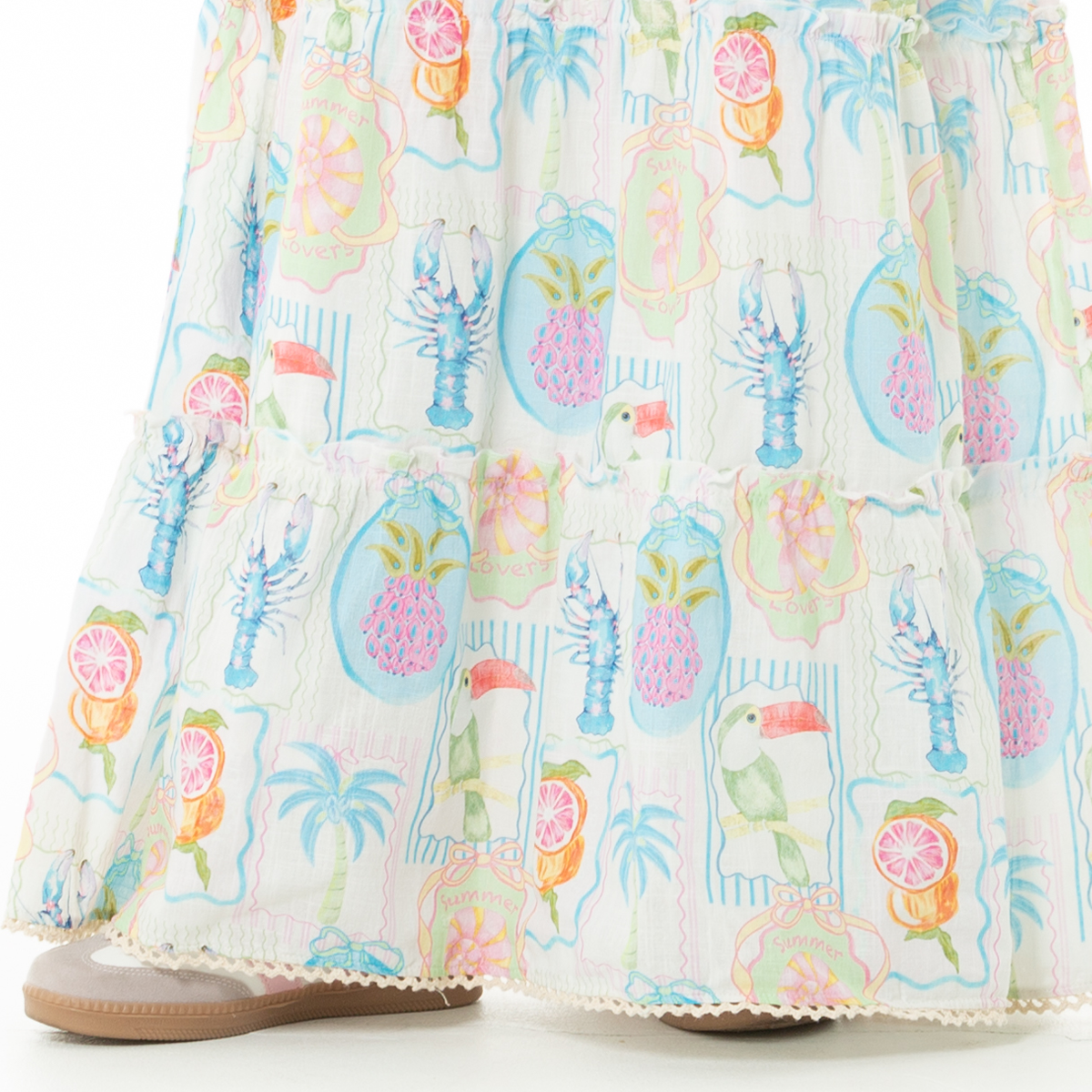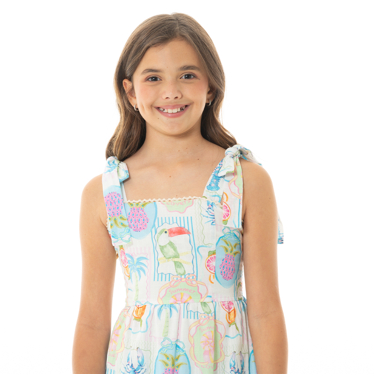 Dale un toque tropical y lleno de alegría al guardarropa de tu pequeña con este hermoso vestido largo🌸. Este vestido destaca por su colorido estampado veraniego con motivos de tucanes, piñas, palmeras y frutas tropicales. El diseño presenta tirantes con lazos ajustables en los hombros, un escote cuadrado con delicado borde festoneado y una falda amplia de tres niveles, que aporta movimiento y comodidad en cada paso ¡Luce hermosa con este outfit!