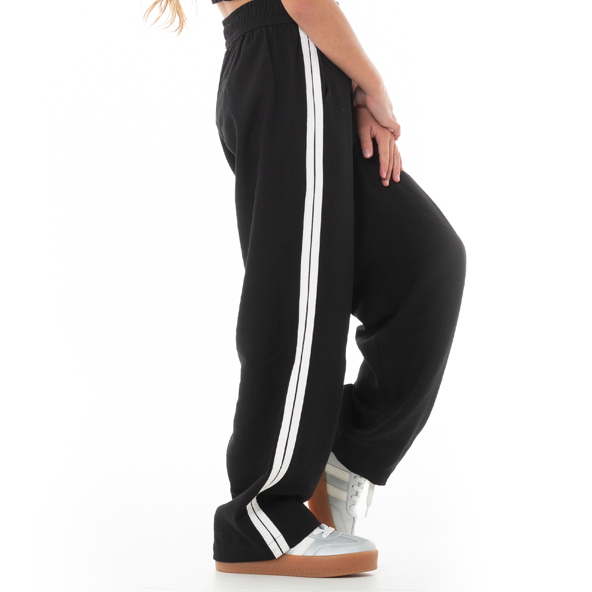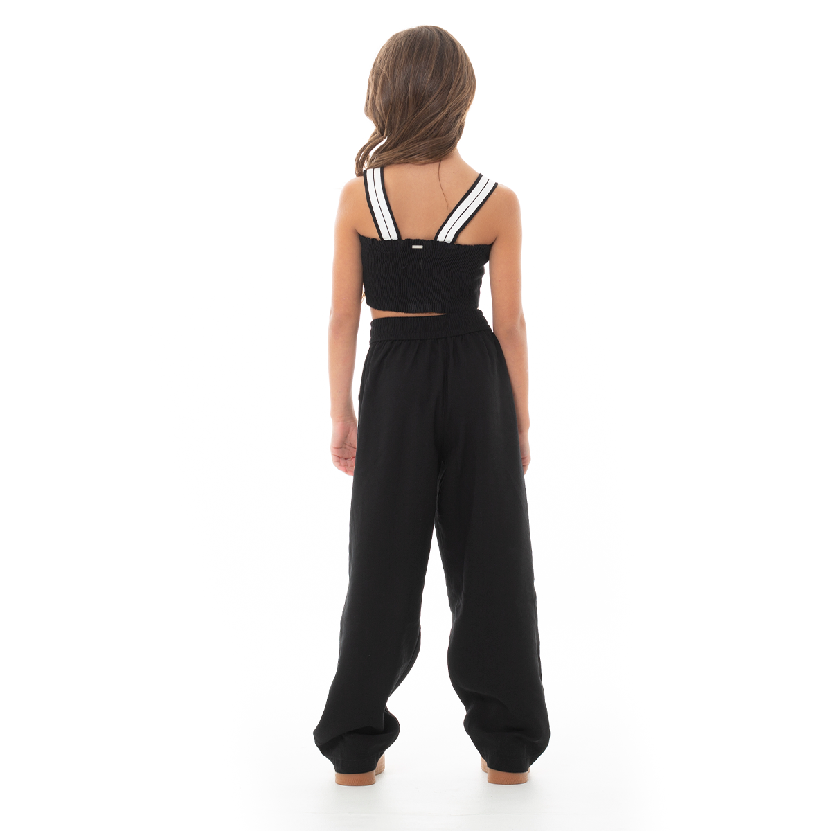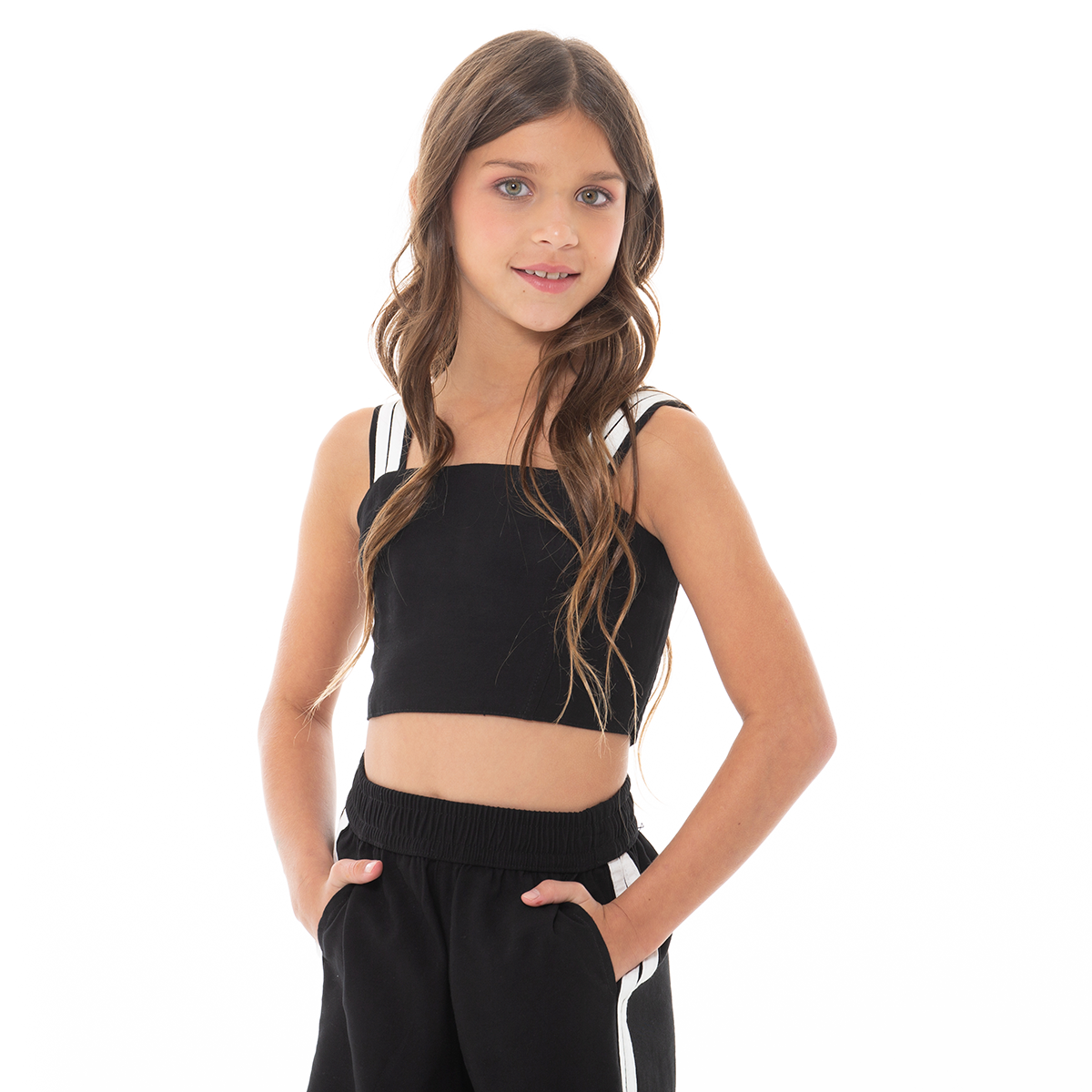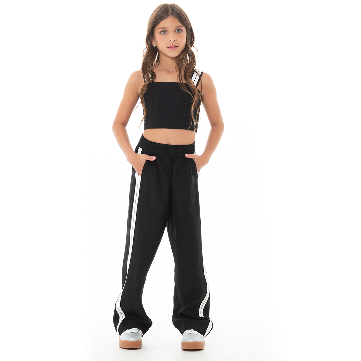 Este conjunto de crop top y pantalón combina comodidad y estilo en una sola prenda. Diseñado en un tono negro moderno. El crop top con tiras dobles aporta frescura y libertad de movimiento, mientras que el pantalón de tiro alto y bota ancha con franjas laterales ofrece un look relajado y versátil. ¡Lúcete con nuestros diseños Nauty Blue!