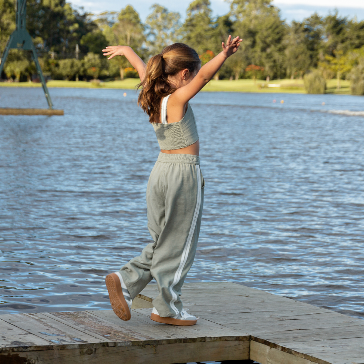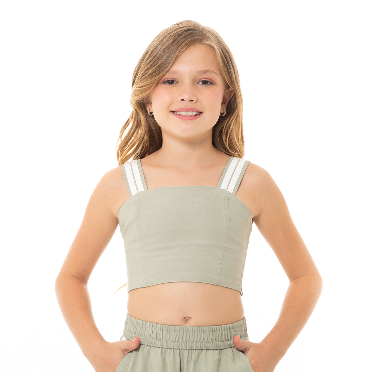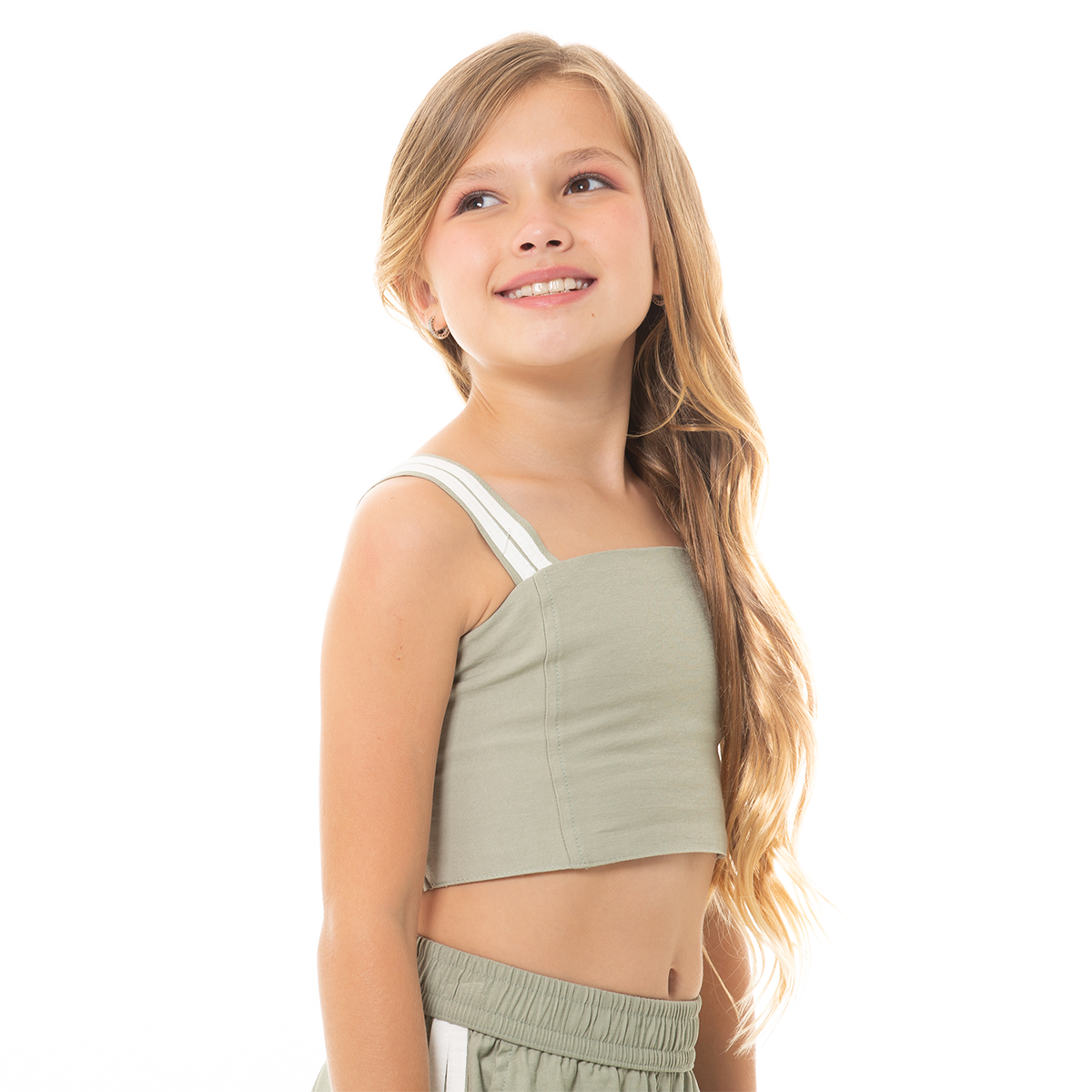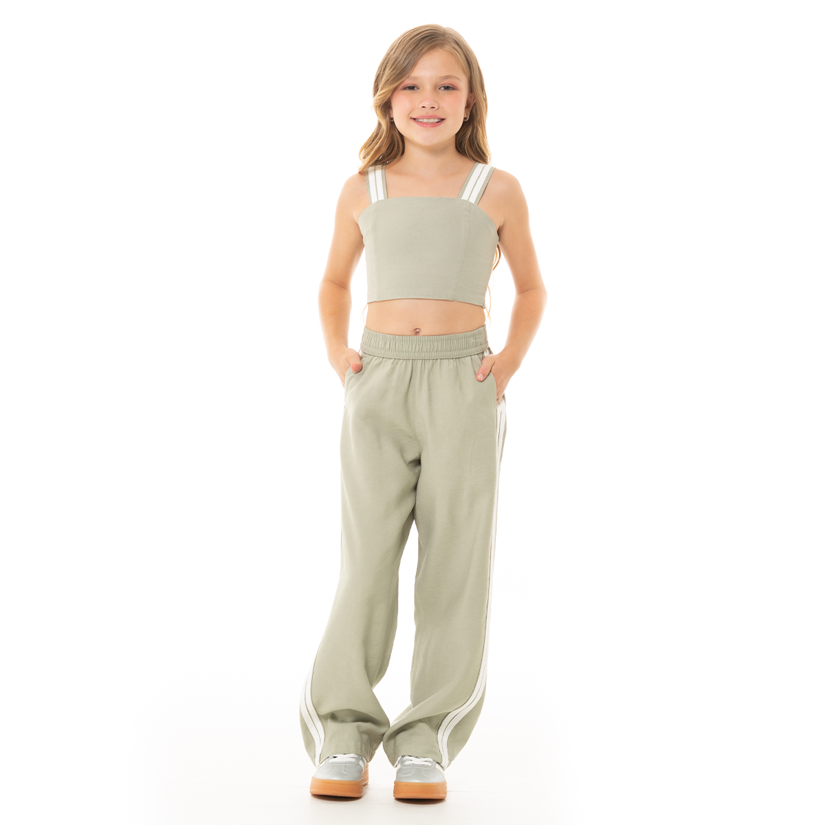 Este conjunto de crop top y pantalón combina comodidad y estilo en una sola prenda. Diseñado en un tono verde suave y moderno. El crop top con tiras dobles aporta frescura y libertad de movimiento, mientras que el pantalón de tiro alto y bota ancha con franjas laterales ofrece un look relajado y versátil. ¡Lúcete con nuestros diseños Nauty Blue!