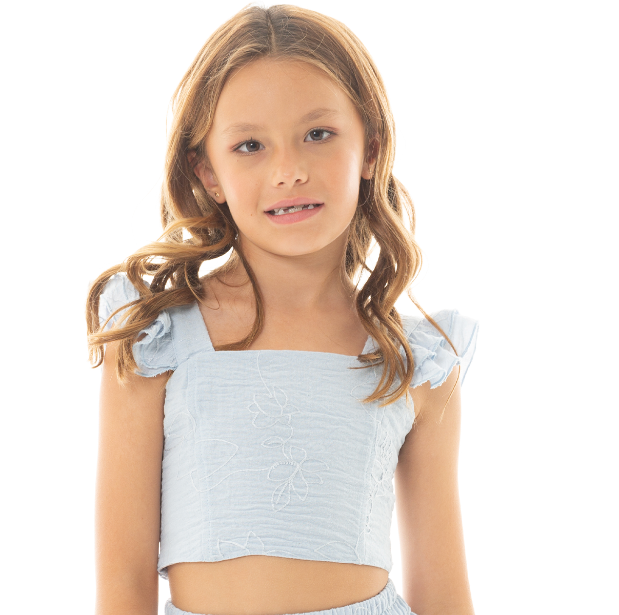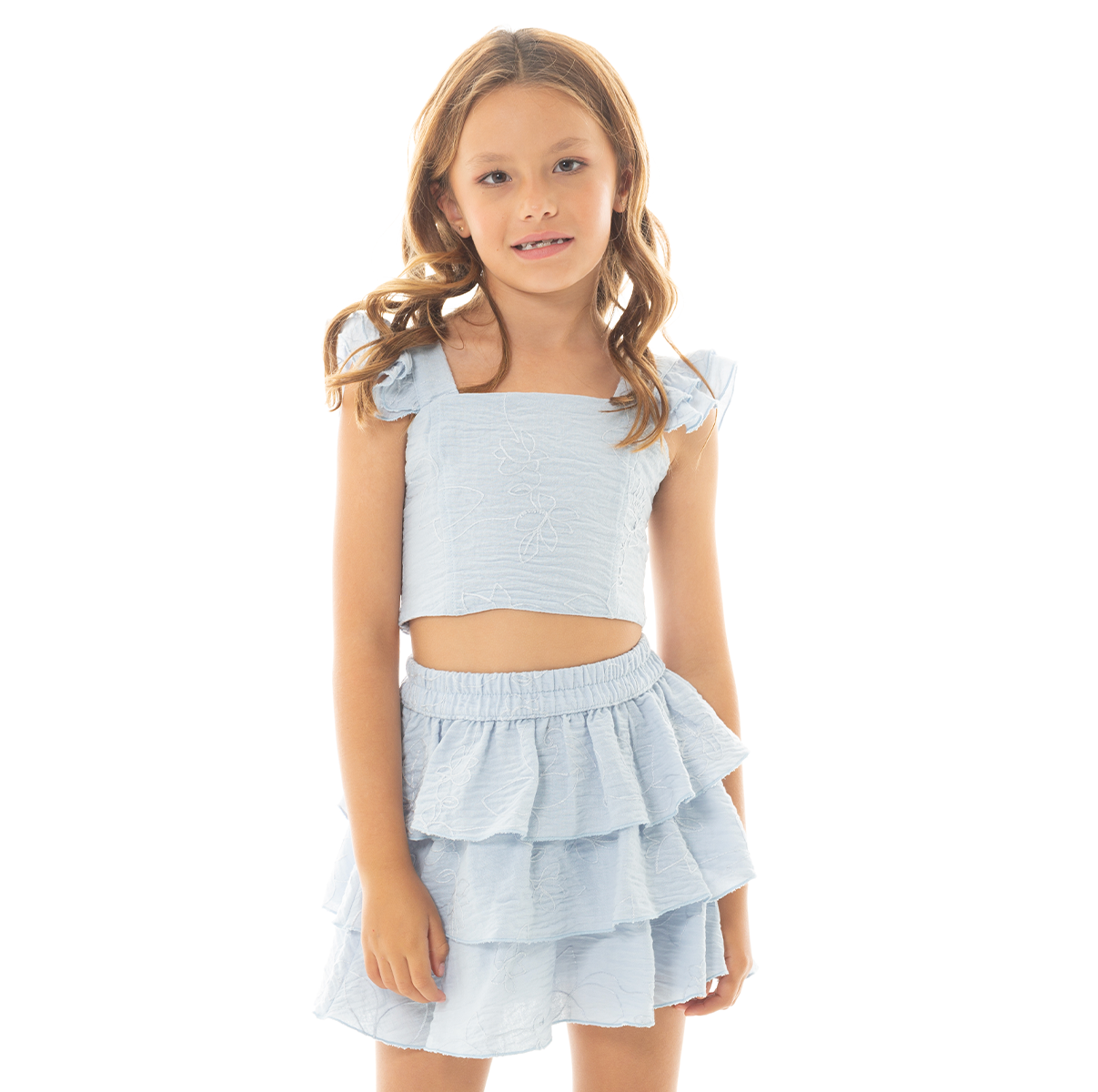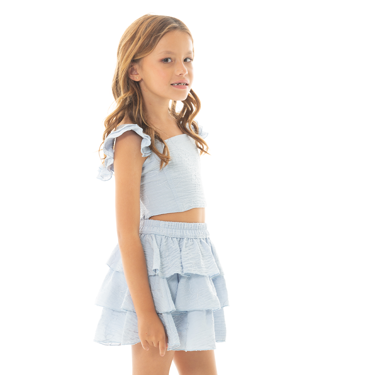 Este encantador set de dos piezas está diseñado especialmente para niñas que aman verse lindas y sentirse cómodas. Con un delicado tono celeste pastel, este set incluye un top crop con tirantes de volantes y una falda de capas con vuelos ¡Perfecto para cualquier ocación!