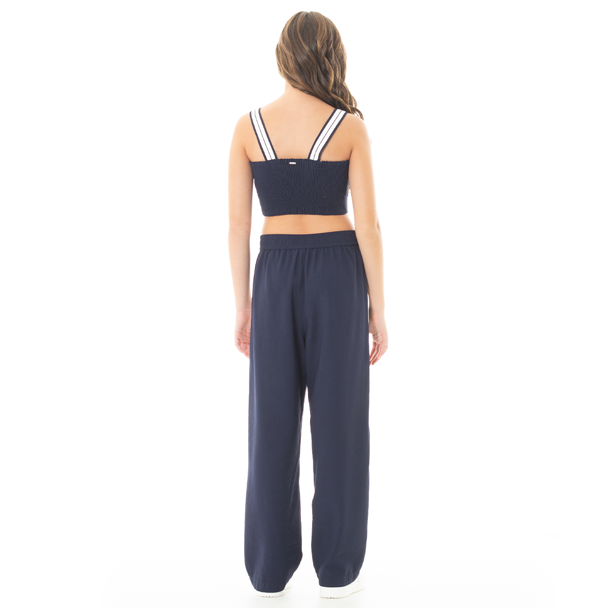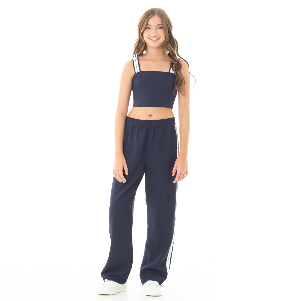 Este conjunto de crop top y pantalón combina comodidad y estilo en una sola prenda. Diseñado en un tono azul rey moderno. El crop top con tiras dobles aporta frescura y libertad de movimiento, mientras que el pantalón de tiro alto y bota ancha con franjas laterales ofrece un look relajado y versátil. ¡Lúcete con nuestros diseños Nauty Blue!