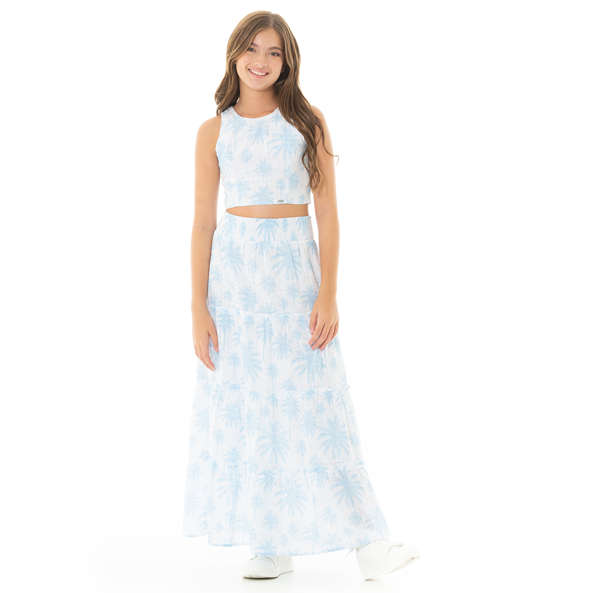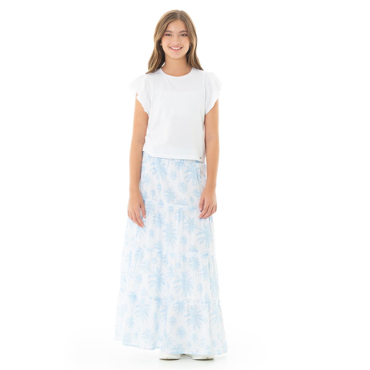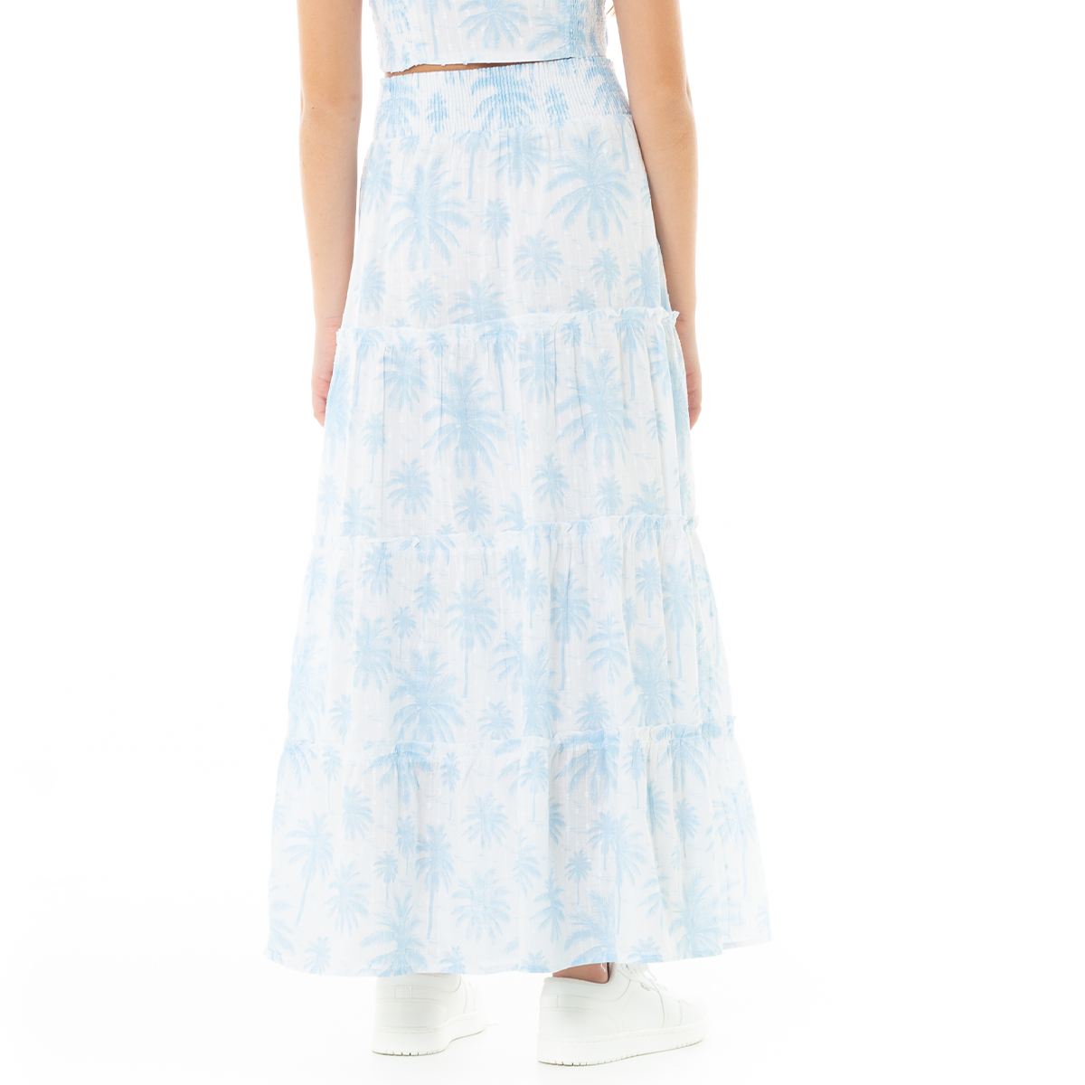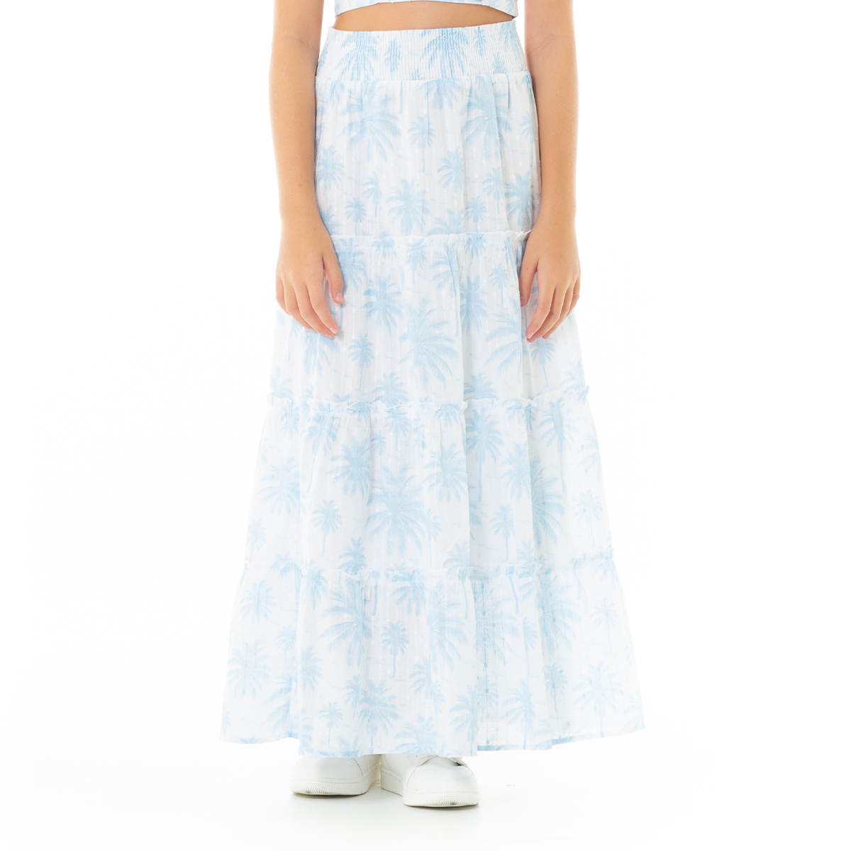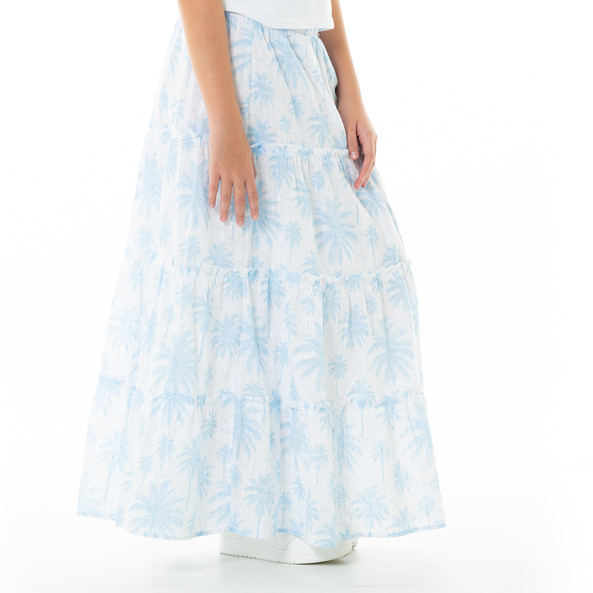 Nuestra falda larga de corte amplio con diseño de capas y estampado tropical en tonos azul celeste sobre fondo blanco. Confeccionada en un tejido ligero y texturizado, esta prenda ofrece un movimiento fluido y una caída natural que aporta frescura y estilo. ¡Un básico infaltable de Nauty Blue!