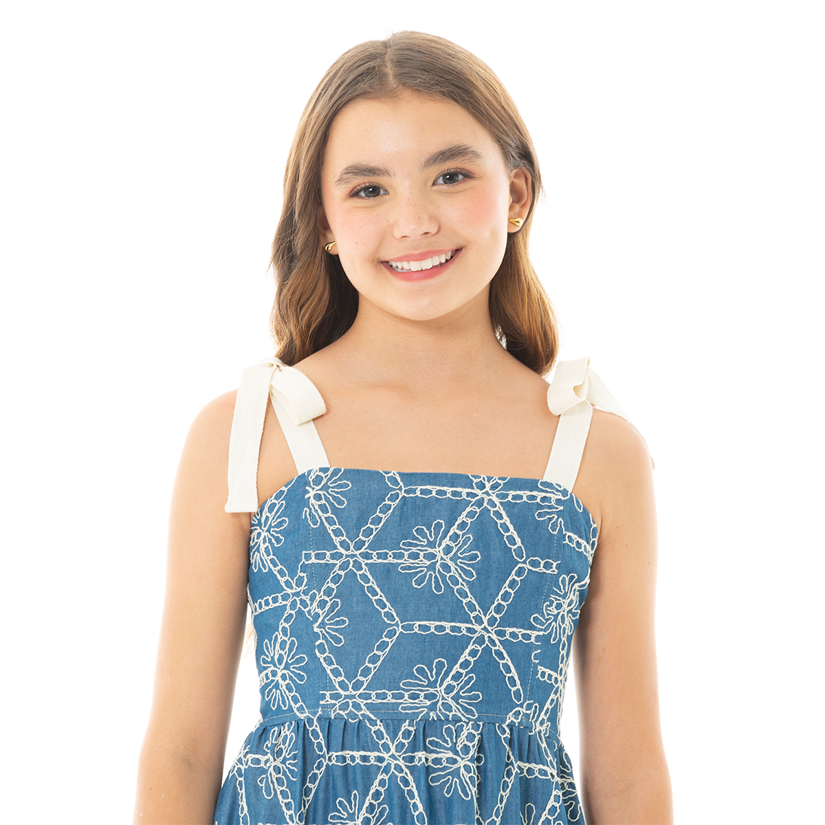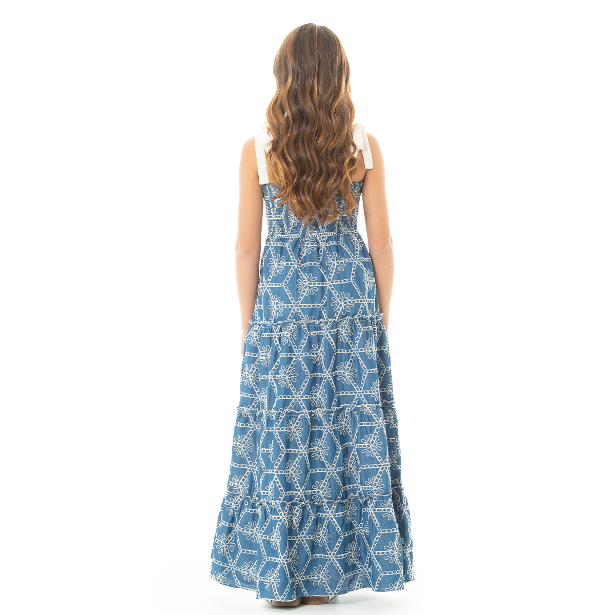 Este vestido largo para niñas destaca por su combinación de frescura y elegancia, proporcionando un equilibrio perfecto entre estilo y confort. Confeccionado en una tela azul de textura suave que presenta un bordado blanco en relieve con motivos geométricos y florales que aporta un acabado artesanal distintivo y sofisticado. ¡Luce hermosa con este outfit!