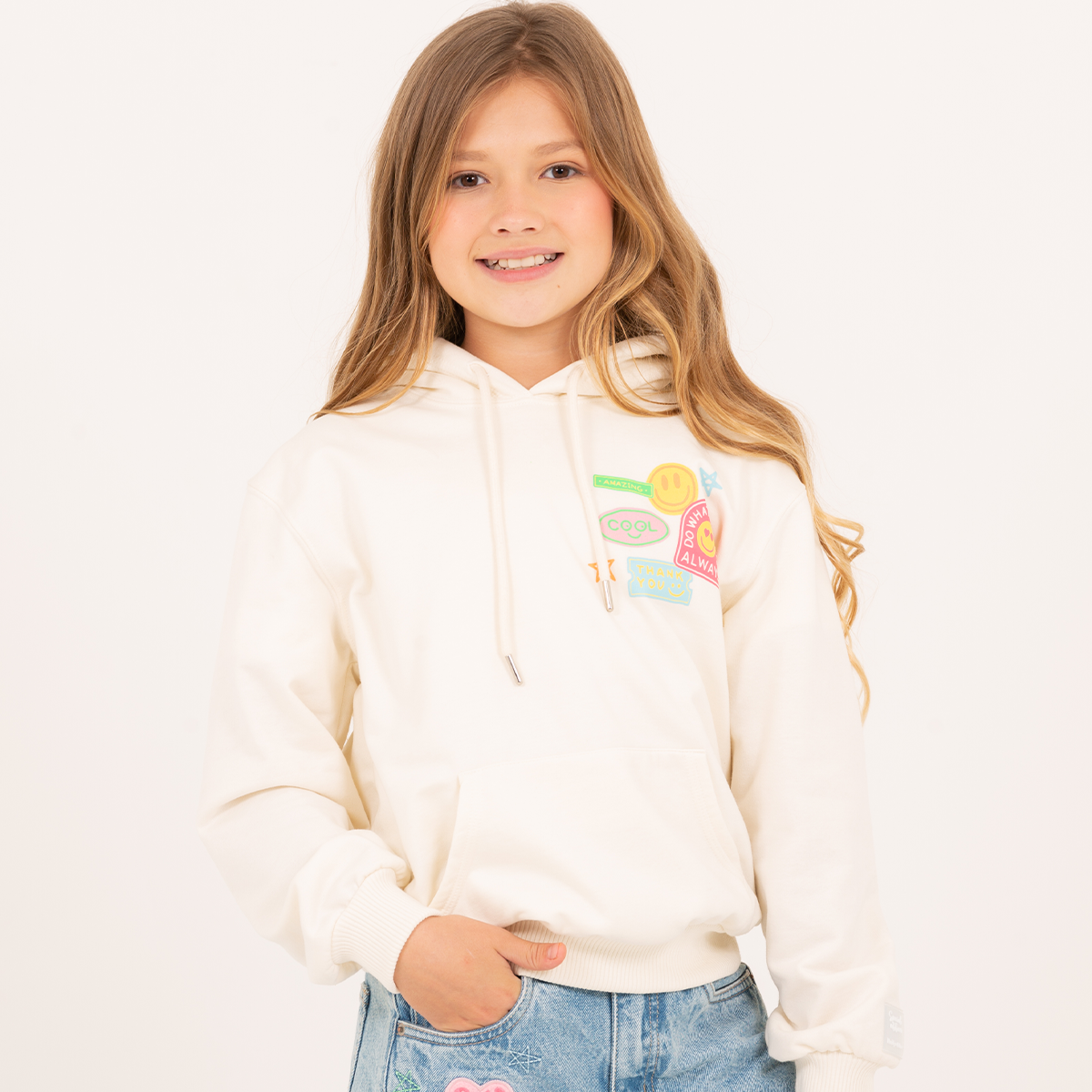 Hoodie color marfil con gráficos en frente y espalda para un look divertido y lleno de actitud.