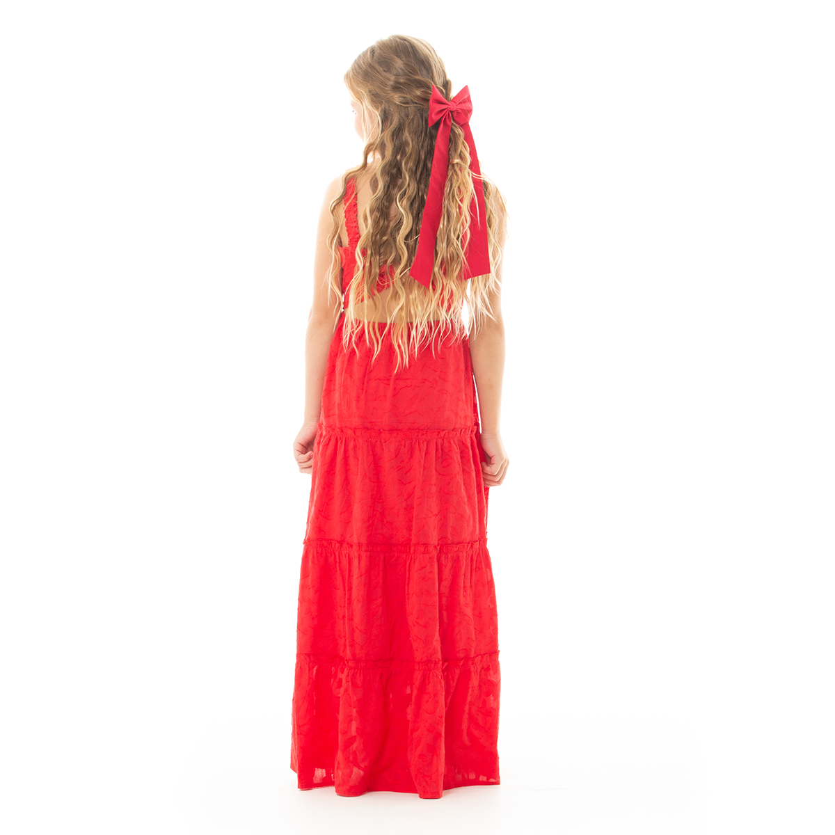 ¡Un vestido que roba miradas y sonrisas! ✨Este encantador vestido destaca por su hermosa textura en tela con un vibrante tono rojo, lleno de detalles delicados que lo hacen único y especial. Su diseño de tirantes fruncidos continúan hasta la parte posterior, donde se unen con un hermoso moño central ajustable en la espalda, que permite adaptar el vestido para un mejor ajuste al cuerpo brindando un look fresco, alegre y encantador. ¡Luce hermosa con este outfit!