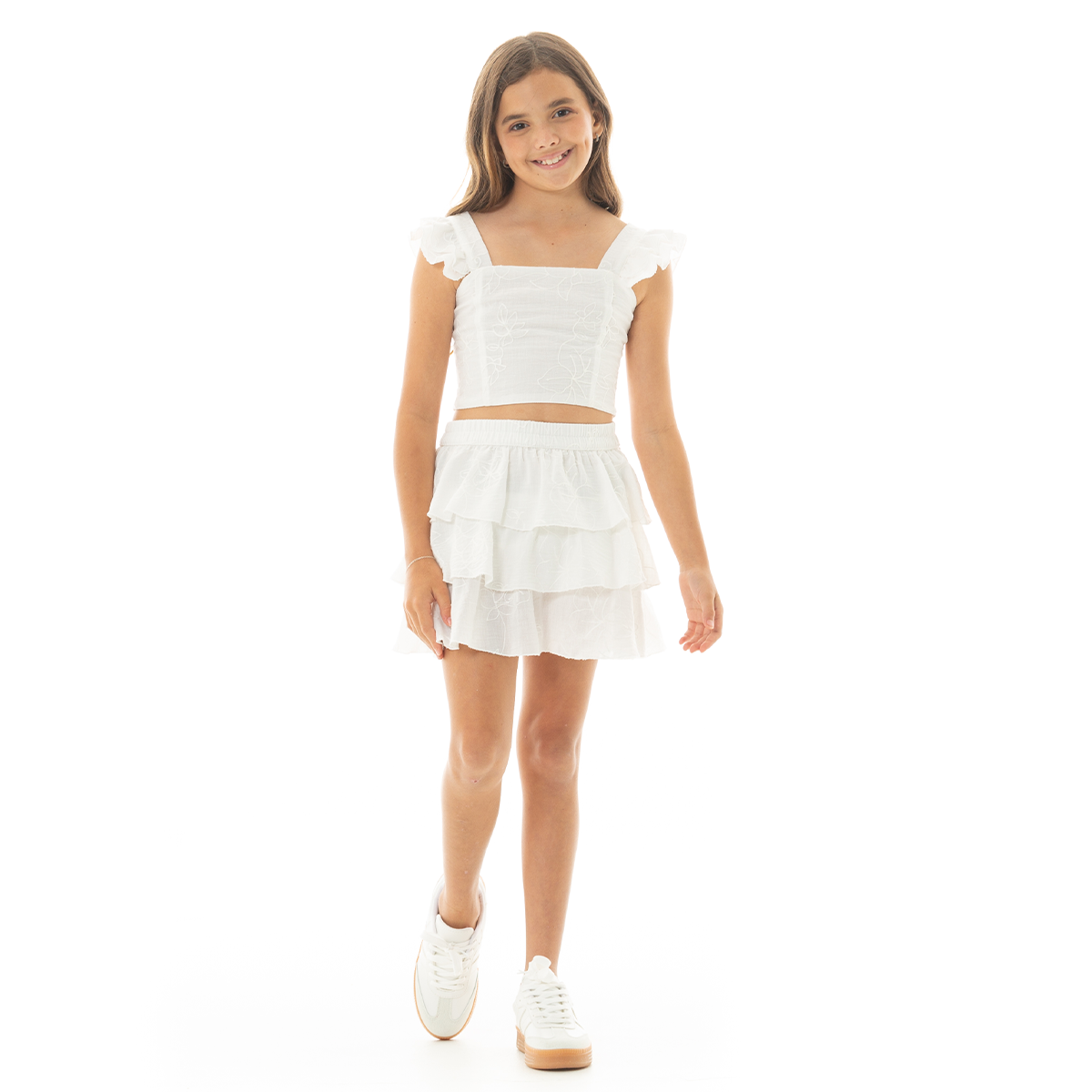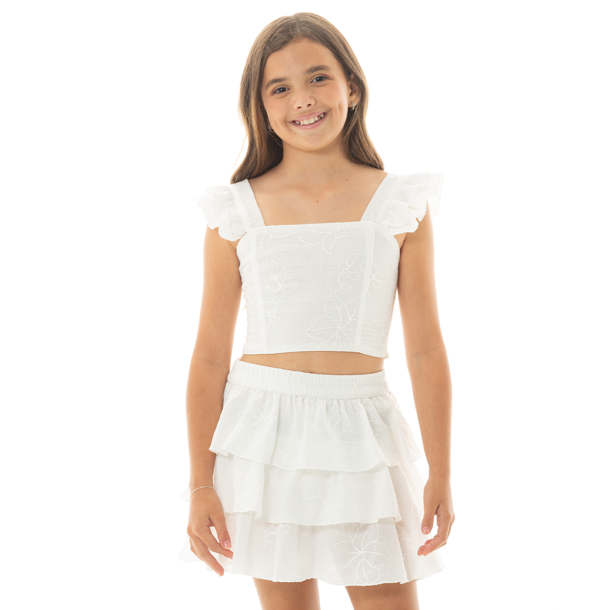 Este hermoso conjunto de dos piezas es ideal para niñas que quieren lucir adorables y estar cómodas. Presenta un tono clásico y dulce, con un crop top de tirantes con volantes y una falda con capas y vuelos. ¡La elección perfecta para cualquier ocasión!