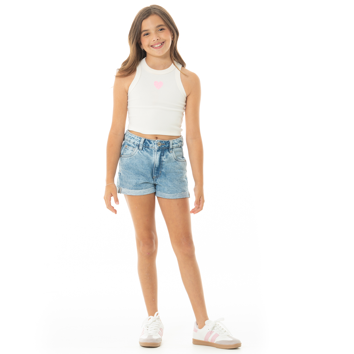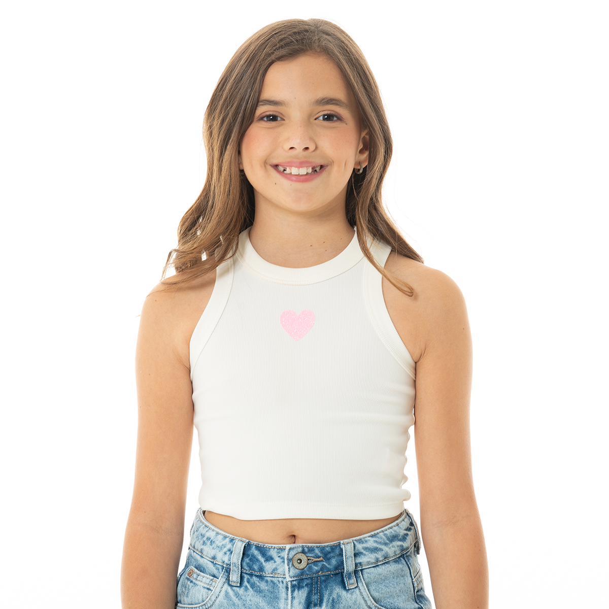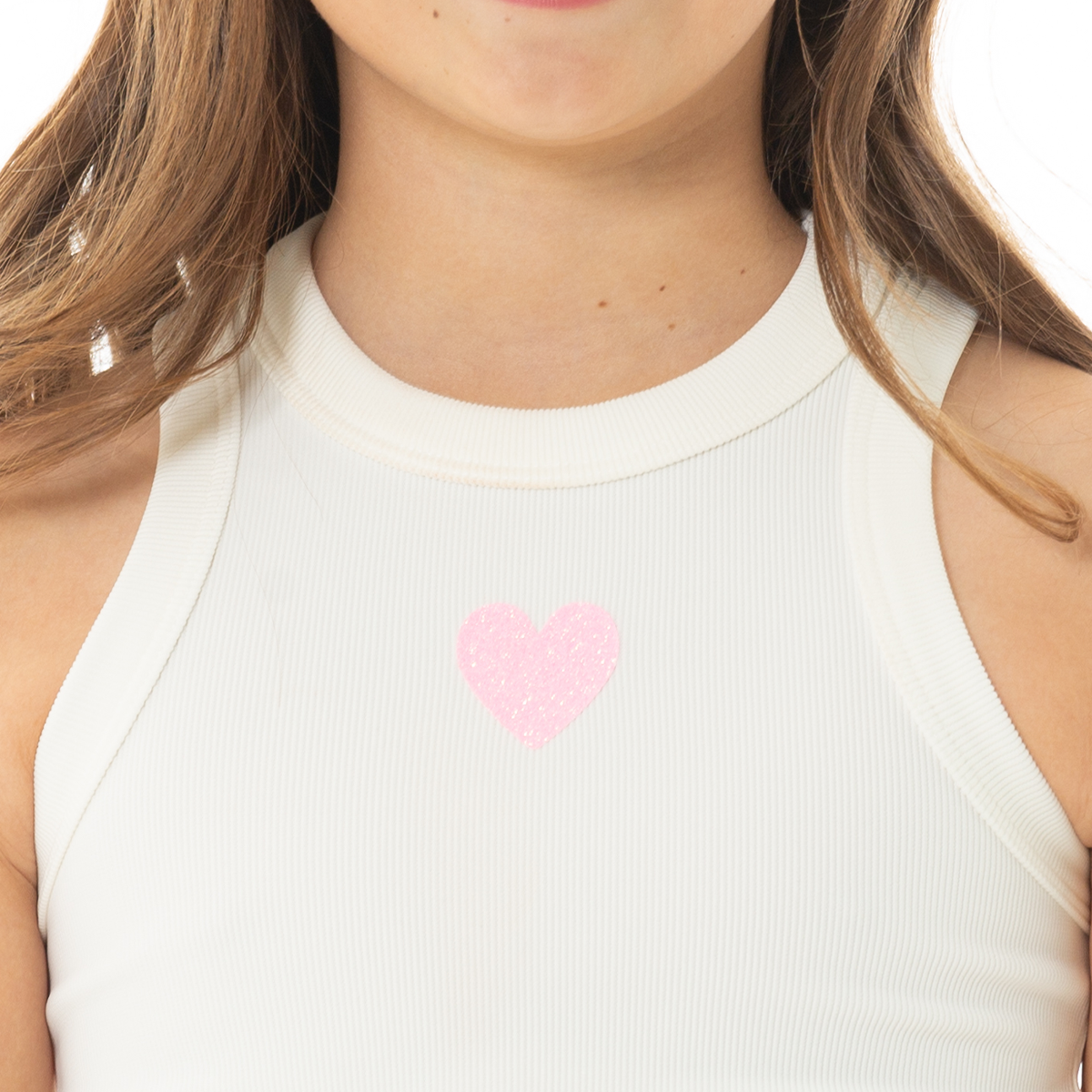 Este crop top es una prenda esencial con un toque distintivo. Su diseño moderno se realza con un corazon en glitter delicadamente estampado en el centro del pecho, añadiendo un detalle sutil pero con personalidad.. ¡Un básico con un toque de brillo que no puede faltar!