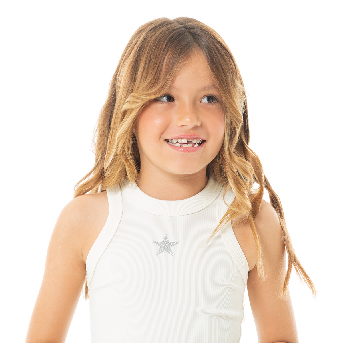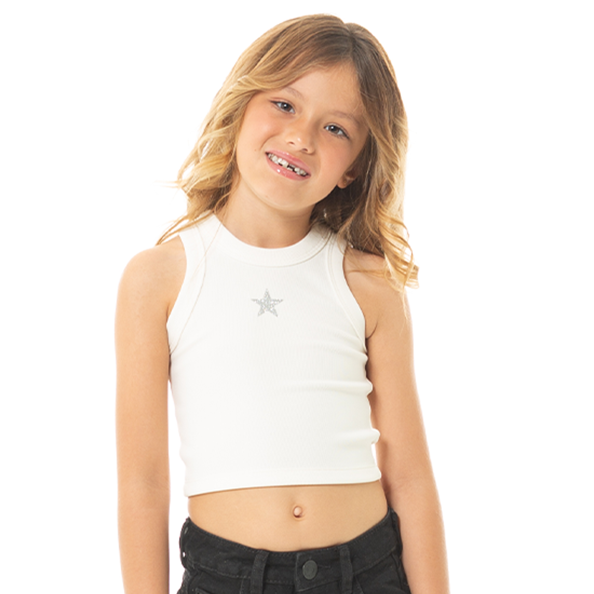 Luce un estilo moderno y versátil con este crop top, diseñado en tela de canalé que se adapta cómodamente. Su detalle distintivo es la estrella plateada brillante en el centro, que añade un toque chic y juvenil, ideal para quienes buscan destacar con un look casual pero con personalidad. ¡Un Básico infaltable para tus outfits Nauty Blue!