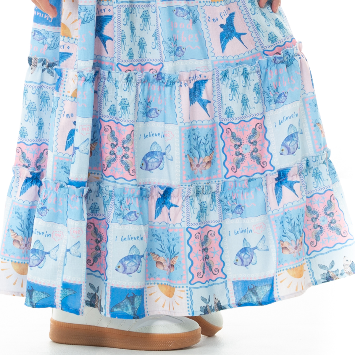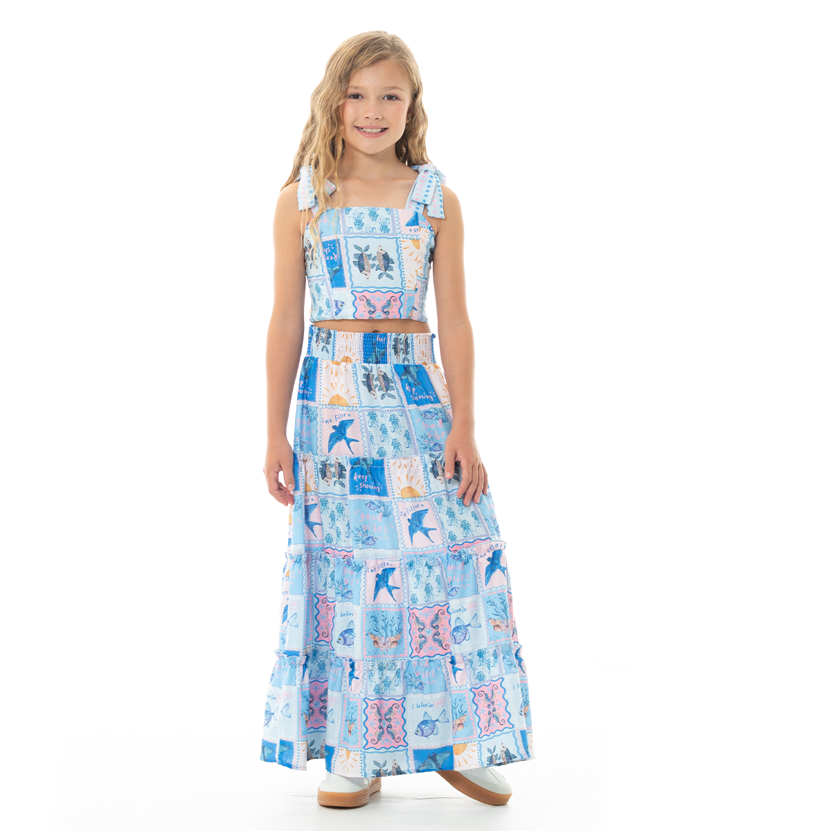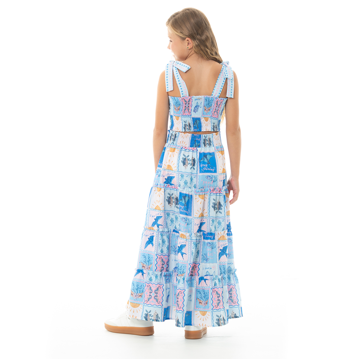 ¡Un conjunto que roba miradas y transmite pura vibra veraniega! 🌊Este conjunto de falda larga y crop top para niñas combina frescura, comodidad y un diseño encantador. Su estampado tipo patchwork en tonos azules con detalles de peces, soles y figuras marinas crea un look alegre y lleno de personalidad.El crop top cuenta con tiras ajustables con lazo en los hombros que brinda mejor ajuste y comodidad. La falda larga en niveles aporta movimiento, además de una cintura elástica que se adapta perfectamente para mayor confort ¡Siéntete linda con este set!