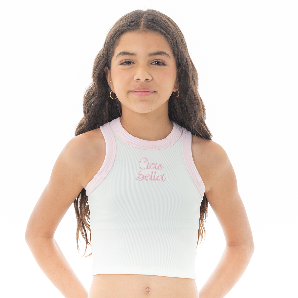 Una prenda esencial con un aire moderno y delicado🌸. Este crop top para niñas destaca por su silueta ajustada y estructura en rib que brinda comodidad y excelente adaptación al cuerpo. El contraste en rosa pastel en cuello y sisas, junto al bordado frontal “Ciao bella”, aporta un acabado limpio, femenino y contemporáneo, ideal para looks casuales con estilo.¡Un Básico infaltable para tus outfits Nauty Blue!