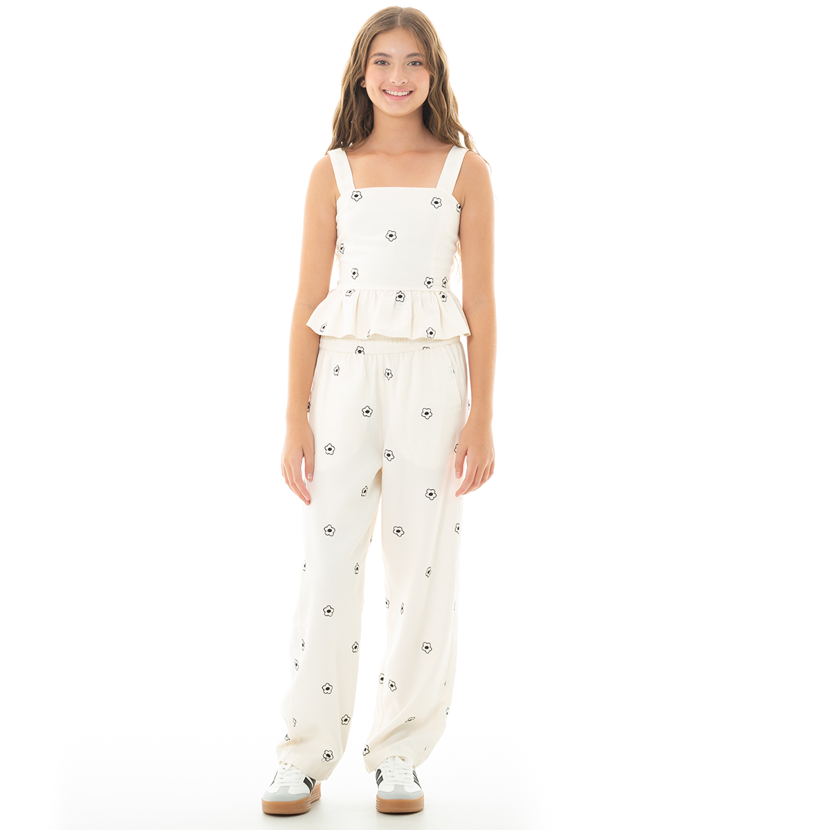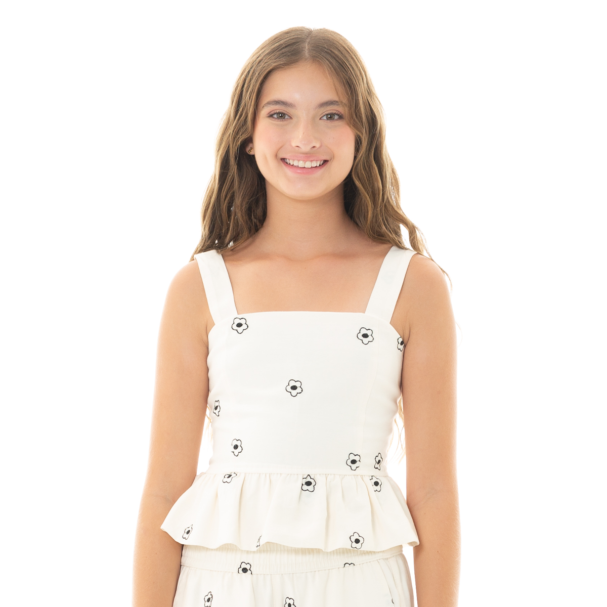 Este hermoso crop top en tono marfil es la prenda ideal para lograr un look fresco, delicado y lleno de estilo🌸. Confeccionado en un tejido ligero con flores bordadas sutiles que le aportan un toque único y especial. Su diseño cuenta con tiras anchas que brindan mayor soporte y comodidad, además un corte ajustado en la parte superior que estiliza la silueta, mientras que en la parte inferior incorpora un bolero (peplum) con caída suave que añade movimiento y un acabado encantador ¡Una prenda imprescindible para tus looks Nauty Blue!