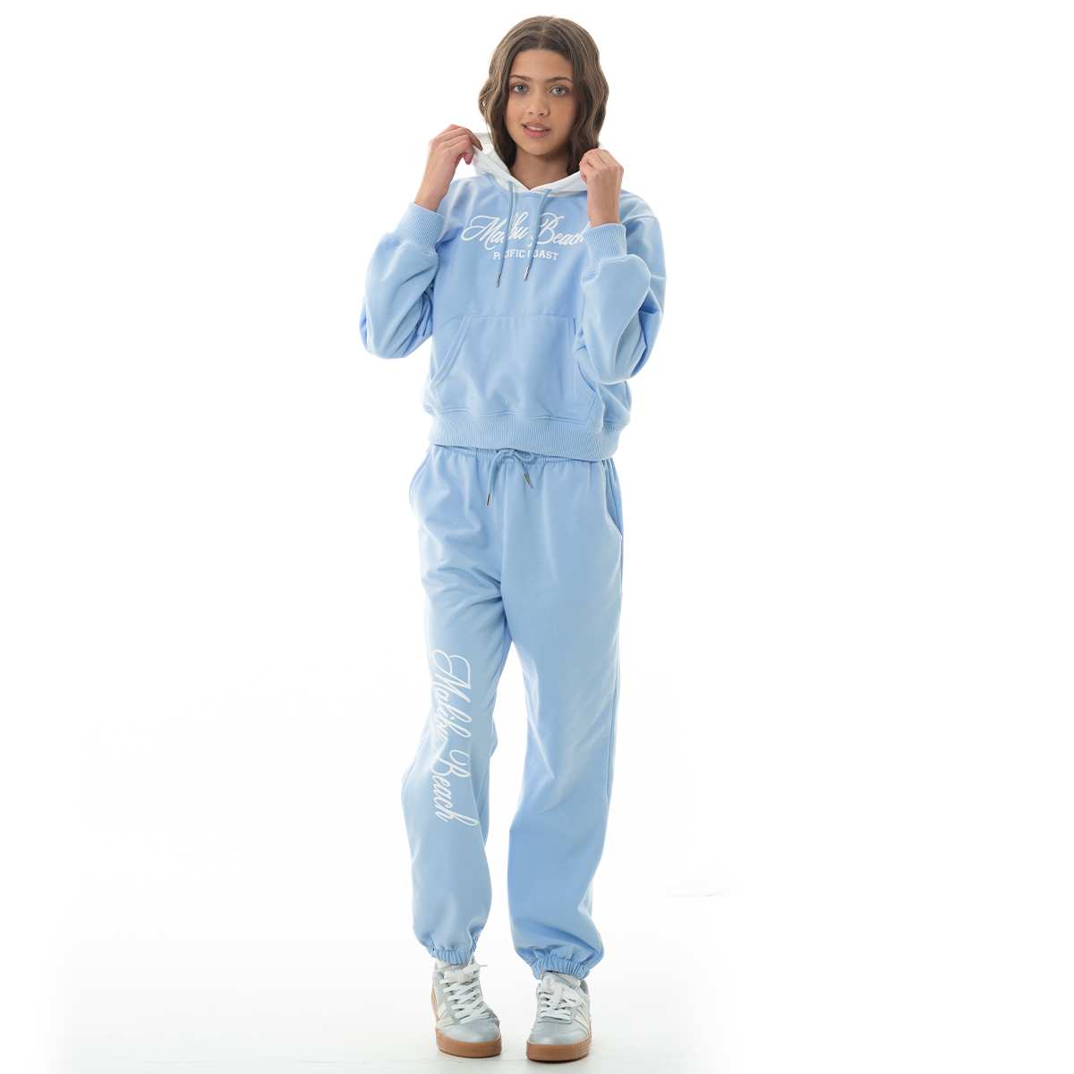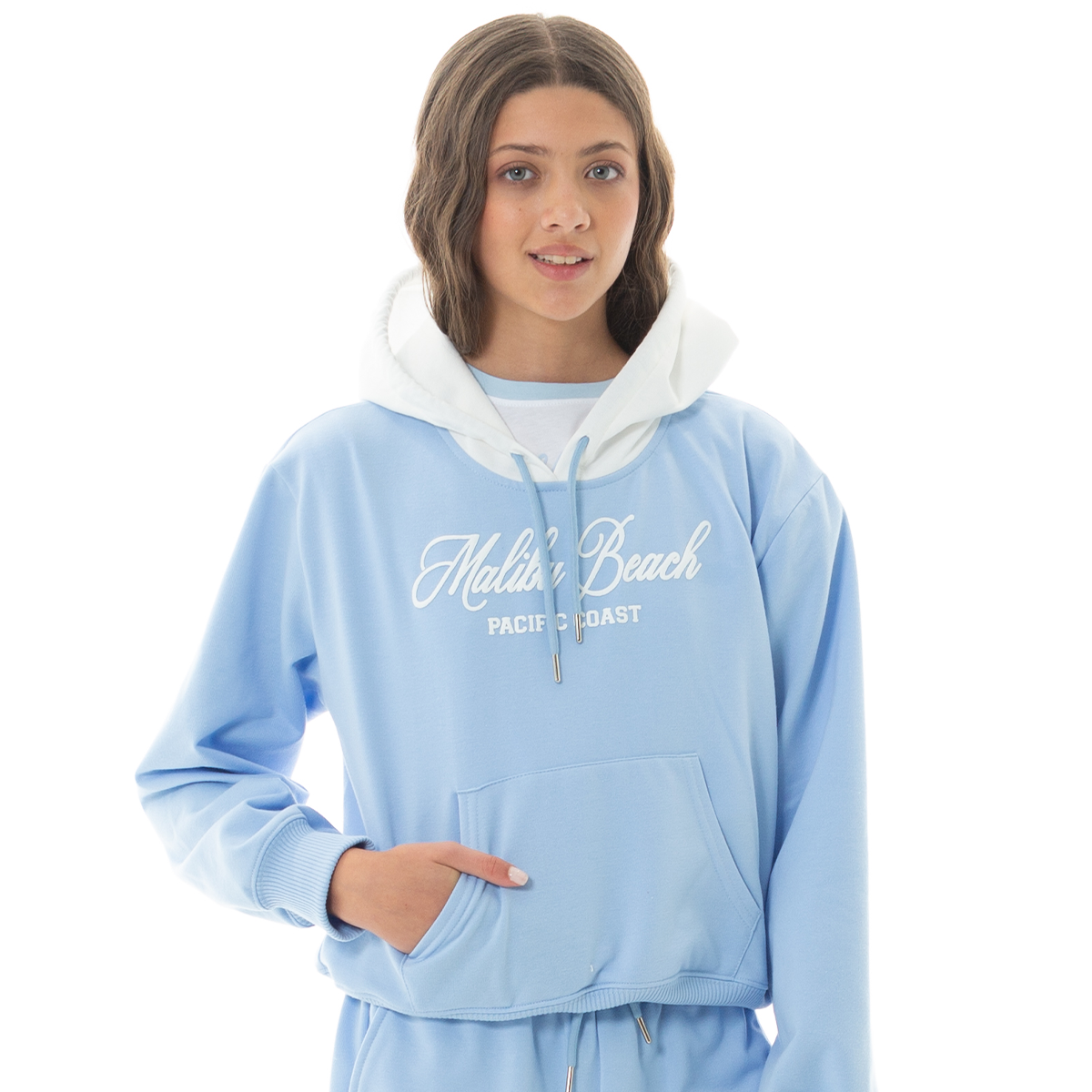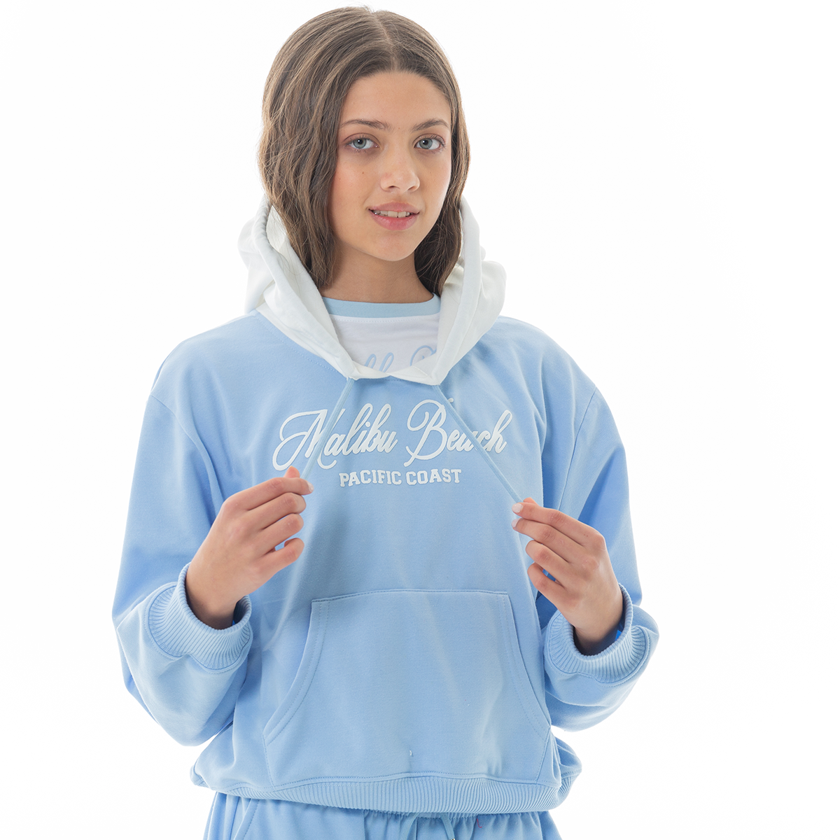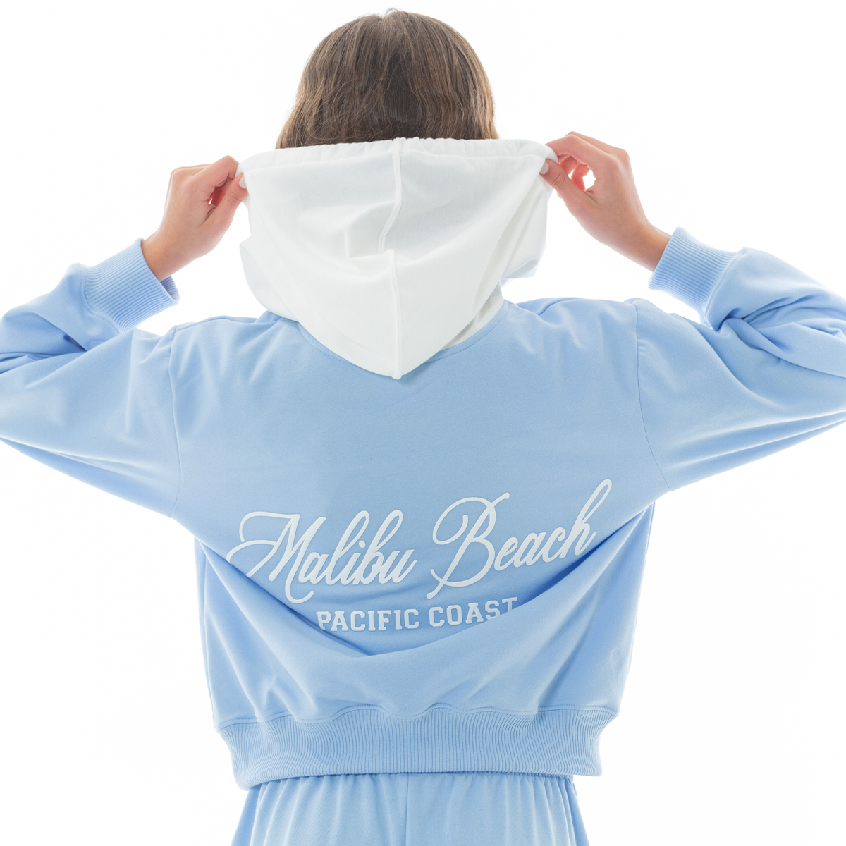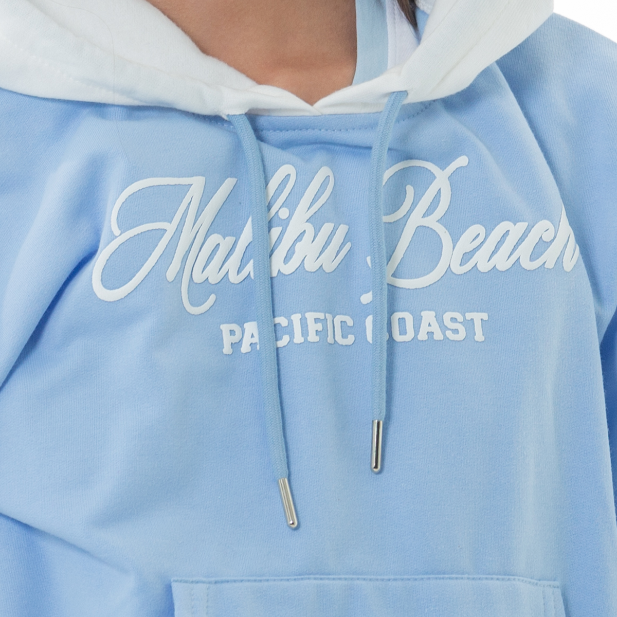Este hoodie en tono azul cielo con capucha en contraste resalta por su estampado frontal y posterior "Malibu Beach – Pacific Coast" 🌴, aportando un look juvenil y actual. Su tela de tacto suave brinda comodidad, mientras los puños y fajón acanalados ayudan a mantener la estructura de la prenda. El bolsillo tipo canguro y el cordón ajustable en capucha complementan un acabado práctico y moderno !Lucete con Nauty Blue!