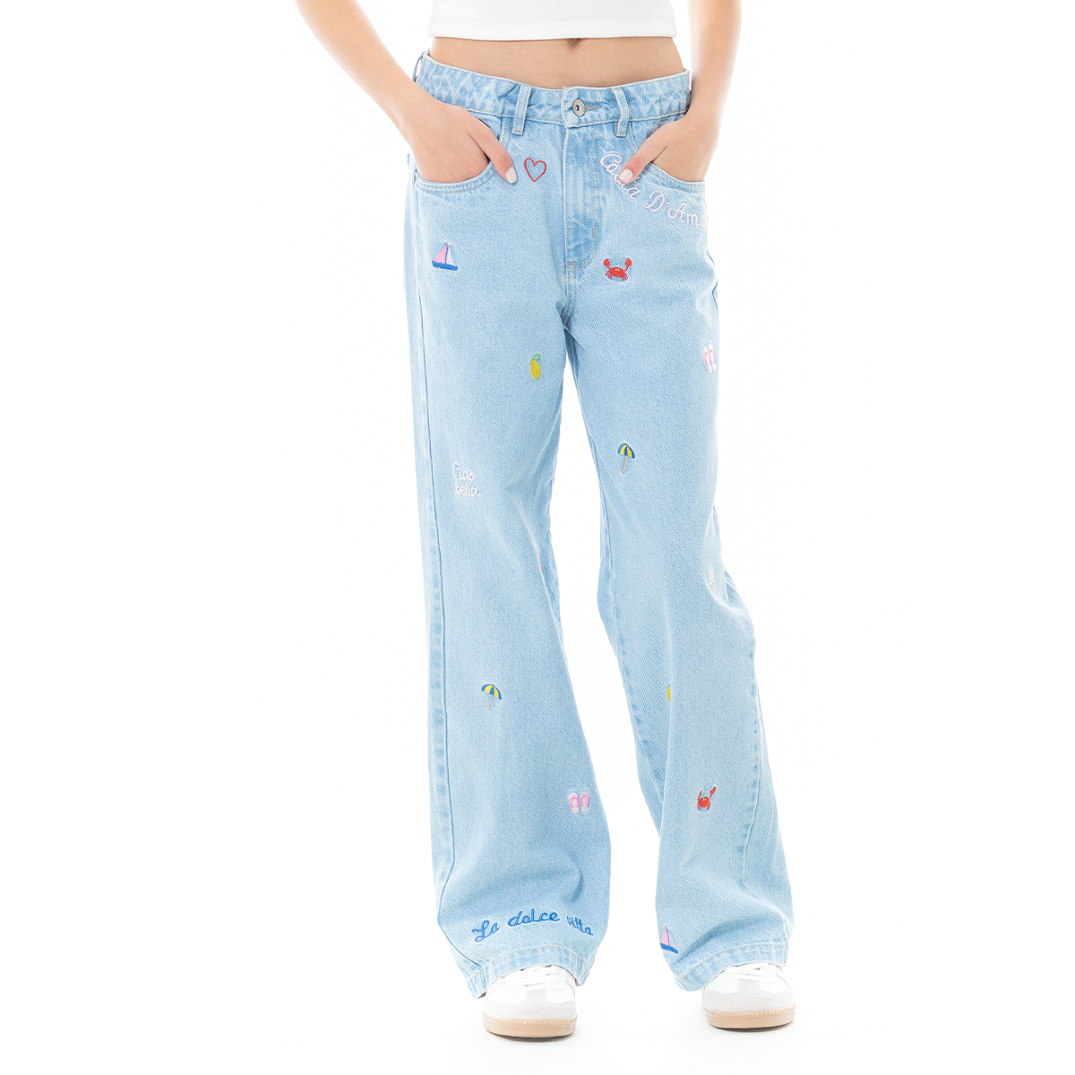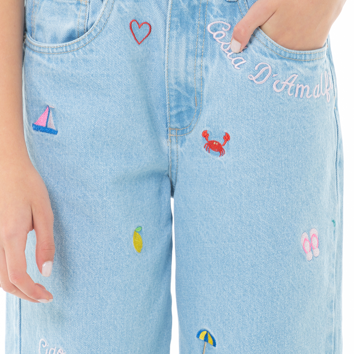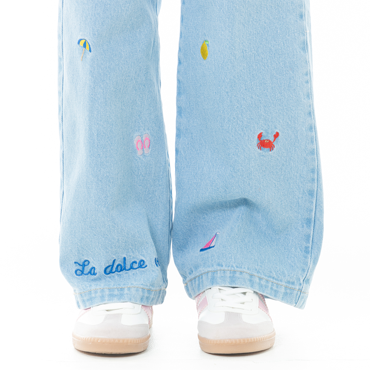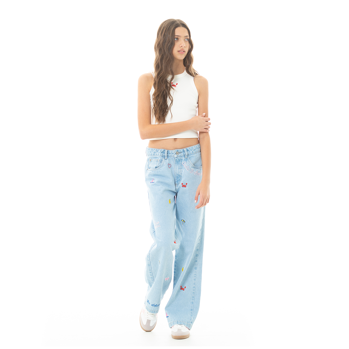 ¡Cómodo, divertido y lleno de personalidad!💙 Este jean azul claro es perfecto para niñas que aman un look moderno y creativo. Su diseño destaca por múltiples figuras bordadas en tonos de colores que le dan un estilo único, juvenil y lleno de personalidad. Su denim es suave, resistente y con una silueta amplia tipo wide leg, ideal para usar todos los días con total comodidad ¡Un básico especial para los outfits Nauty Blue!