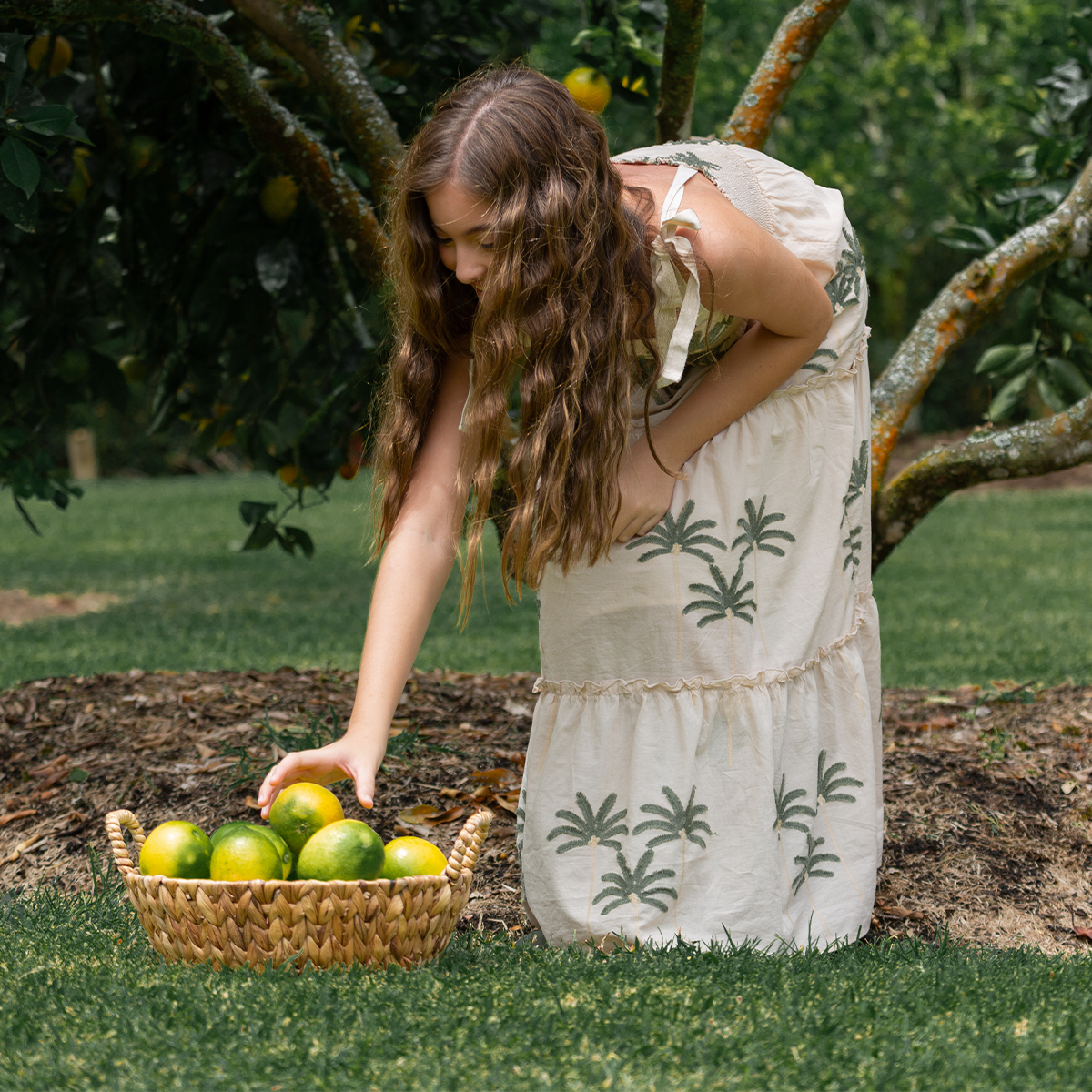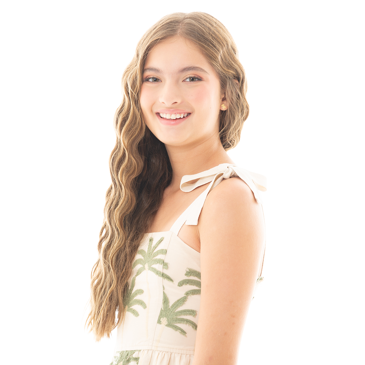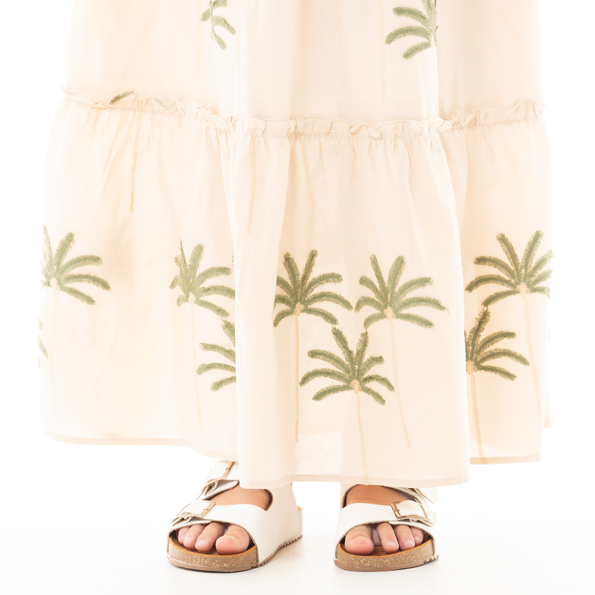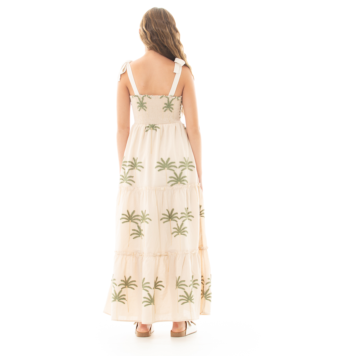 Este encantador vestido largo para niñas combina frescura, movimiento y un diseño lleno de personalidad. Confeccionado en un tono crema suave, destaca por su tejido ligero y fluido que brinda total comodidad durante todo el día. El diseño presenta un estampado de palmeras bordadas en color verde, distribuidas de manera armoniosa a lo largo de toda la prenda, aportando un estilo natural y veraniego ¡Luce hermosa con este outfit!