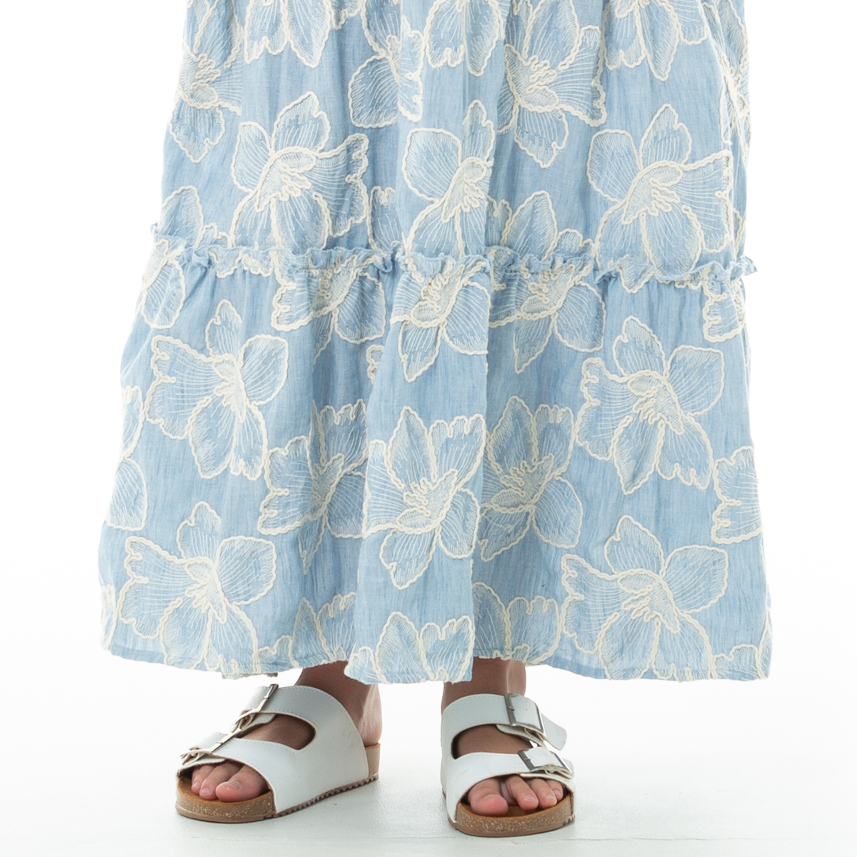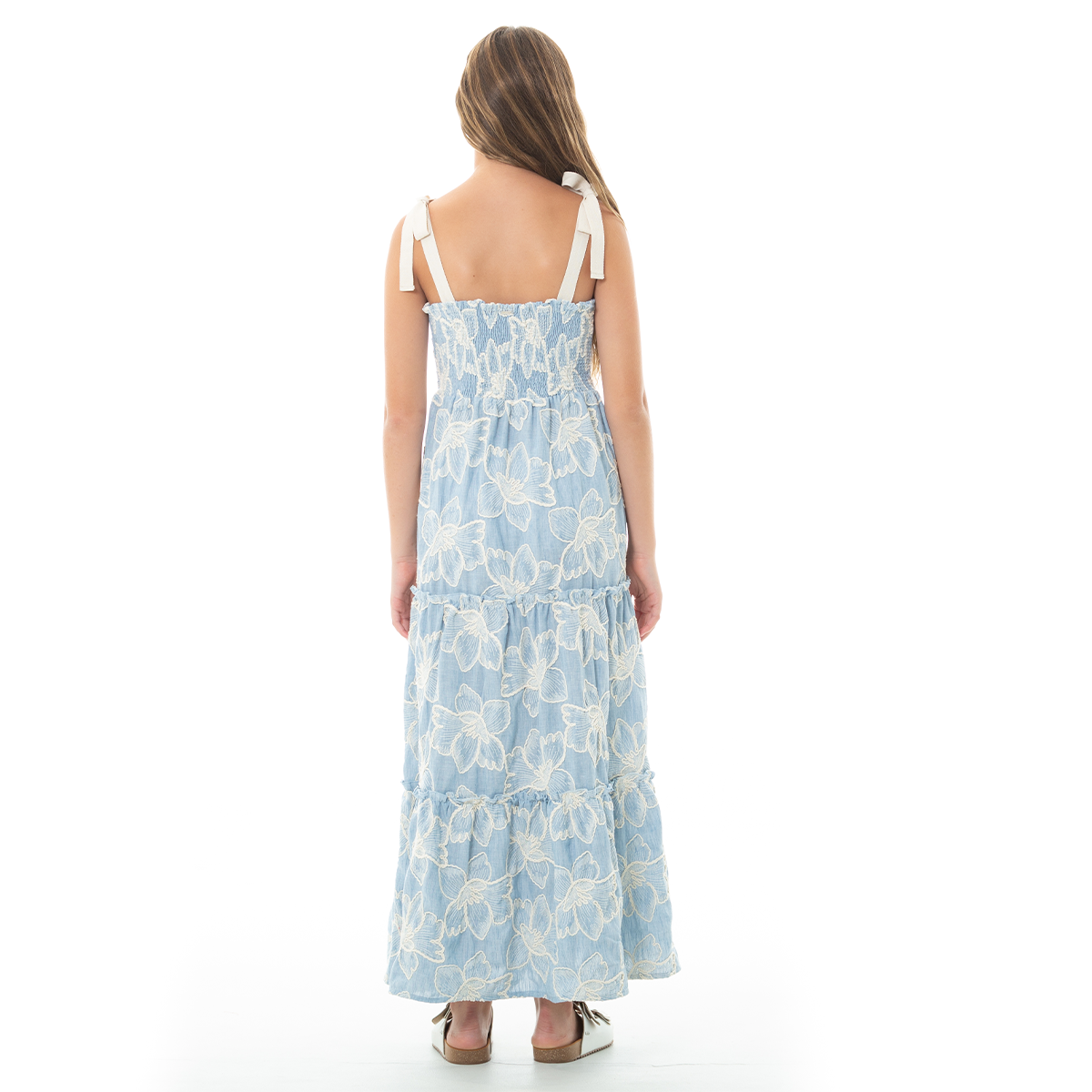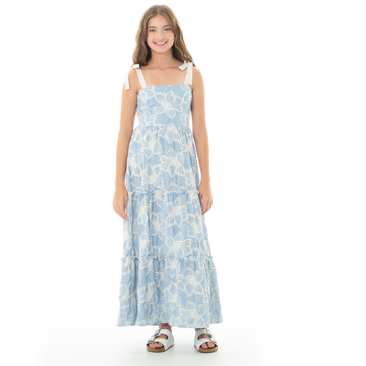 Este vestido largo para niñas es el equilibrio perfecto entre frescura y elegancia✨. Confeccionado en un delicado tono azul claro, su tela suave y ligera tiene un hermoso bordado en relieve con motivos florales, que le da un acabado artesanal. El diseño de escote recto y los cortes horizontales estilizan la figura, mientras que la espalda con nido de abeja garantiza un ajuste cómodo y flexible. Los tirantes anchos, adornados con moños decorativos, añaden un toque dulce y encantador a esta prenda tan especial ¡Luce hermosa con este outfit!